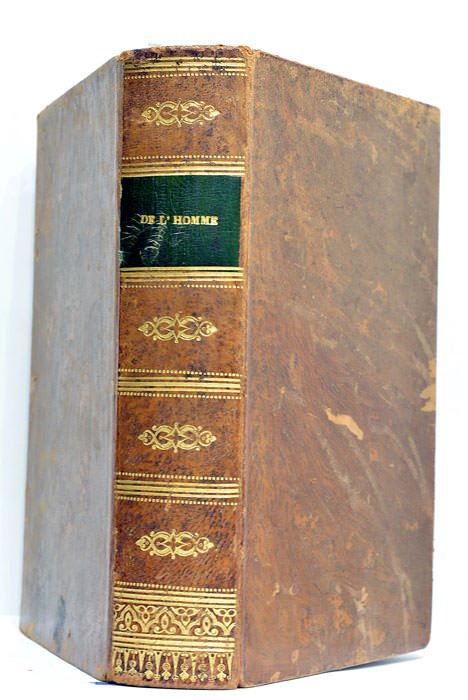 3 ouvrages en 1 volume. 1). 4 feuillets. 234 pages. 1 feuillet. 1 planche hors-texte. 2). 278 pages. 2 feuillets. 1 planche dépliante hors-texte. 3). 186 pages. (16x11 Cm). Plein veau. Dos lisse orné. Pièce de titre en maroquin vert. Coins et coiffes émoussés. Plats un peu frottés. 1). Edition Originale rare de l'un des principaux ouvrages de Césarie Farrenc. Femme de lettres née à Draguignan, elle écrivit de très nombreux romans destinés aux enfants. Dédié au comte de Portalis, l'ouvrage contient une illustration représentant le petit homme gris, protagoniste du récit. 2). Edition Originale. Ouvrage de philosophie politique illustré de trois tableaux sur une planche dépliante. L'auteur Adolphe Chouippe était médecin, qualifié de "matérialiste convaincu". 3). Curieux ouvrage anonyme sur les fous. Il évoque les différents types de "fous" selon une classification très élaborée ayant pour but de bien différencier les vrais fous de ceux que l'on traite abusivement comme tels, comme les abolitionnistes de la Traite des Noirs à qui il est dédié. Composé sous forme de petits dialogues, il met en scène les suicidés, les hallucinés, les ivrognes et les génies. Bon exemplaire.