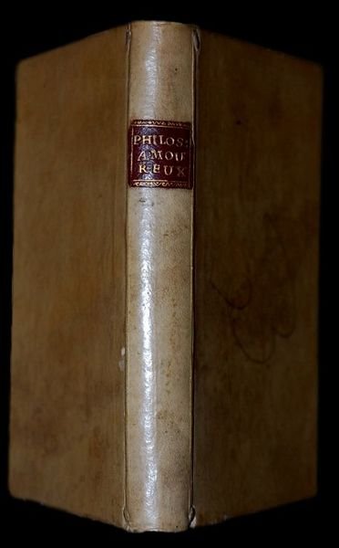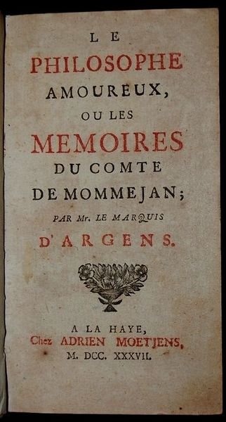 In 12° (13,5×7,5 cm); (8), 268 pp. Bella legatura coeva in piena pergamena con titolo in oro su fascetta rossa in pelle al dorso. Piatti interni foderati da bella carta marmorizzata coeva. Testatine, finalini ed iniziali ornati. Piccolo difetto della carta a pagina 245, pre stampa, che ha creato un piccolo strappetto senza perdita di carta abilmente e anticamente restaurato al margine esterno bianco. Alcune pagine leggermente ed uniformemente brunite come tipico della carta utilizzata a La Haye. Tagli marmorizzati. Frontespizio in rosso e nero. Fregio figurato in fine: due putti reggono un festone, al centro un cuore fiammeggiante. Esemplare nel complesso in ottime condizioni di conservazione. Antica firma di proprietà privata settecentesca alla prima carta bianca del celebre senatore e bibliofilo veneziano Giacomo Soranzo (1686-1761) che raccolse una delle più grandi collezioni settecentesche di volumi composta da quattromila manoscritti e ventimila opere a stampa poi venduta in un famoso catalogo stampato nel 1780. Prima assai rara edizione, due soli esemplari censiti in ICCU, di questo importante scritto galante, uscito tradotto in italiano nel 1764 con il titolo Il filosofo innamorato ovvero le memorie del conte di Mommejan opera del grande scrittore, filosofo ed avventuriero francese Jean-Baptiste de Boyer, marchese d Argens (Aix-en-Provence, 24 giugno 1704 Castello di La Garde, 11 gennaio 1771). Figlio di un procuratore generale, seguì la carriera darmi (entrò nellesercito a 15 anni) e condusse una giovinezza molto avventurosa e licenziosa, per via della quale venne diseredato dal padre. Ferito davanti a Philipsburg nel 1734, lasciò il servizio militare e si ritirò ad Amsterdam nei Paesi Bassi, al fine di potervi scrivere liberamente i propri pamphlet. Qui scrisse alcune compilazioni storiche e cominciò le sue famose Lettres juives (The Hague, 6 volumi, 1738-1742), Lettres chinoises (The Hague, 6 volumi, 1739-1472), e le Lettres cabalistiques (2ª ed., 7 volumi, 1769); scrisse inoltre le Mémoires secrets de la république des lettres (7 volumi, 1743-1748), in seguito rivedute e accresciute come Histoire de lesprit humain (Berlino, 14 volumi, 1765-1768). Attirò lattenzione di Federico II, re di Prussia, con i suoi attacchi contro il Cristianesimo: il sovrano lo chiamò alla sua corte a Potsdam, lo rese suo ciambellano con 6.000 franchi di trattamento e lo nominò direttore generale dellAccademia. Fu nominato Kammerherr e Direttore dellAccademia. Tuttavia, Federico rimase amaramente offeso per via del suo matrimonio con lattrice berlinese Mlle Cochois. Dopo aver vissuto 25 anni in intimità con Federico II, il marchese dArgens tornò a Aix per trascorrere i suoi ultimi anni con la famiglia. Argens tornò infine in Francia nel 1769 e morì nei pressi di Tolone l11 gennaio 1771. Era dotato di unerudizione vasta e varia, e i suoi scritti sono ispirati dalla filosofia scettica dellepoca. I suoi scritti erano indirizzati a un pubblico generico; in questo modo, egli favorì unampia diffusione delle idee dellIlluminismo. Scrisse di filosofia, storia e religione, e semplificò le innovative discussioni empiriche di filosofi come Voltaire, Pierre Bayle e Bernard de Fontenelle.. Opera assai rara ed in buone-ottime condizioni di conservazione e appartenuta ad un celebre collezionista. A good copy, original binding.