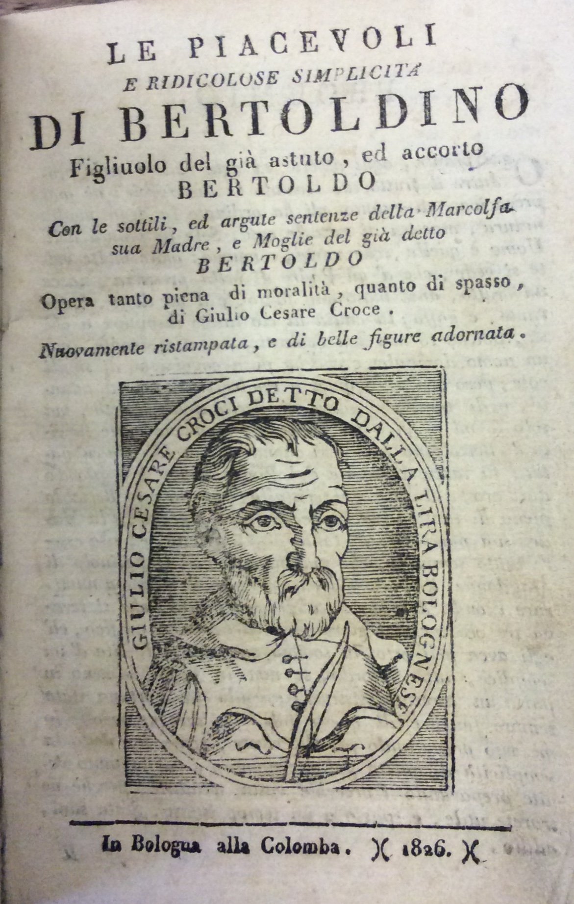 In-24 gr. (mm. 143x94), 2 opere in 1 vol., p. pergam. coeva, pp. 79, con ritratto dell'A. al frontespizio, un finalino e 8 belle vignette nel testo, tutto inc. su legno. Unito a:"Novella di Cacasenno figliuolo del semplice Bertoldino". Opera di spassevole trattenimento, copiosa di motti, sentenze, proverbj, ed argute risposte, aggiunta al Bertoldino del Croce dal Signor Scalligeri dalla Fratta Camillo. Nuovamente ristampata. Bologna, Colomba, 1826, pp. 40, con vignetta al frontesp. e 5 nel testo, sempre silografate. Graziosa edizione ottocentesca della famosa opera del Croce e della novella di Cacasenno. Esempl. ben conservato.
