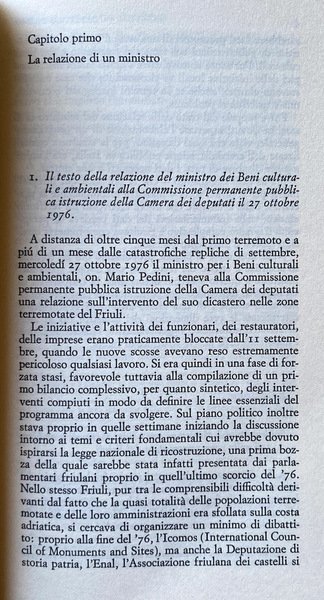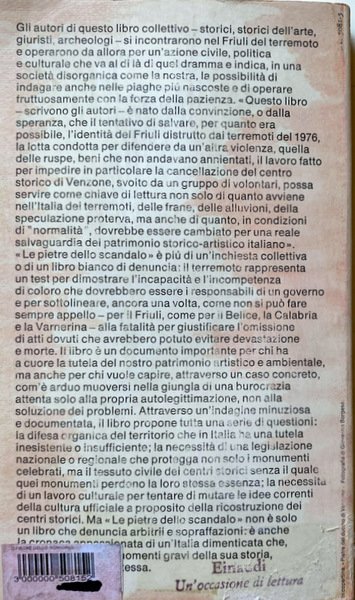 Soggetti: Storia d'Italia, Politica, Disastri naturali, Emergenza, Terremoti, Friuli Venezia Giulia, Saggi, Reportage, Inchieste, Stato, Libri Vintage Fuori catalogo, Patrimonio culturale, Tutela, 1976, Terremoto, Beni culturali, Ricostruzione, Anni Settanta, Morti, Distruzione, Scala Mercalli, Richter, Prevenzione, Costruzione, Edilizia civile, Ingegneria, Ruspe, Frane, Alluvioni, Geologia, Arte, Conservazione, Legislazione, Ambiente, Belice, Calabria, Campania, Irpinia, Denunce, Responsabilità, Governo, Venzone, Centro storico, Varnerina, Omissioni, Soccorsi, Documenti, Relazione, Ministro, Soprintendenza, Cultura, Politica regionale, Normativa, Architettura, Petizione popolare, Camera dei deputati, Cronologia, Eventi storici, Palazzo Civico, Danni, Libro-denuncia, Sisma, Sismologia, Urbanistica, Recupero urbano, Chiese, Scuole, Evacuazione, Piano, Orcolat, Orco, Alpi Giulie, Artegna, Sfollati, Case distrutte, Comuni rasi al suolo, Forgaria nel Friuli, Buia, Pinzano al Tagliamento, Monteaperta, Osoppo, Udine, Pordenone, Gorizia, Giuseppe Zamberletti, Giulio Andreotti, Base aerea di Aviano, Paolo Cossi, Protezione civile, Catastrofi, Faglie, Lesioni, Crolli, Istituzioni, Organizzazioni, Memoria, Prima Repubblica, Novecento, History of Italy, Politics, Natural disasters, Emergency, Earthquakes, Essays, Reportage, Investigations, State, Out of print books, Cultural heritage, Protection, Earthquake, Cultural heritage, Reconstruction, Seventies, Dead, Destruction, Scala Mercalli, Prevention, Construction, Civil construction, Engineering, Bulldozers, Landslides, Floods, Geology, Conservation, Legislation, Environment, Complaints, Responsibility, Government, Historic center, Omissions, Relief, Documents, Report, Minister, Superintendence, Culture, Regional policy, Regulations, Architecture, Popular petition, Chamber of deputies, Chronology, Historical events, Damages, Book-report, Earthquake, Seismology, Urban planning, Urban recovery, Churches, Schools, Evacuation, Plan, Julian Alps, Civil Protection, Disasters, Faults, Injuries, Collapses, Institutions, Organizations, Memory, First Republic, Twentieth Century