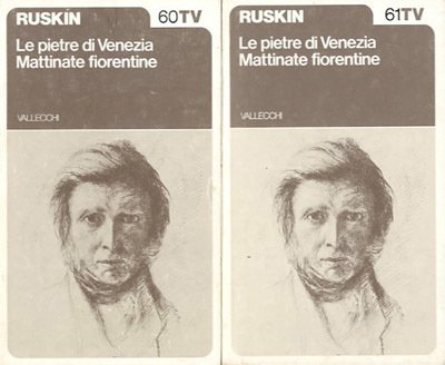 2 v. (XXXVII, 219; 143 p.) : ill. ; 18 x 11 cm. TV Tascabili Vallecchi, 60, 61. Nelle "Pietre di Venezia" lo storico leggerà una documentata analisi dell’evoluzione e del tramonto di una città, di un popolo, di una cultura; il critico vi leggerà la tesi, oggi insostenibile, della decadenza dell’arte nel Rinascimento come specchio della decadenza morale e della degradazione dell’arte in lavoro, dell’artista in operaio. Ma la domanda che guida Ruskin nello studio dei monumenti riguarda la vita, non la tecnica: “Fu felice l’esecutore mentre era all’opera?”. L’arte diventa misura di tutte le cose, canto del cigno di un mondo preindustriale scomparso, di cui Venezia è nobile e triste testimonianza. E così, il lettore sensibile leggerà in quest’opera soprattutto l’omaggio dell’autore al suo ennesimo amore infelice: Venezia, una città morta. L’immagine che apre il volume, le onde che si frangono contro le pietre risuonando come un rintocco funebre, ha influenzato artisti come Proust, Mann e Visconti e li ha legati a questo luogo magico e triste. "Mattinate fiorentine" è una guida turistica raffinata e una lettura deliziosa: questo offrono le sei lettere delle Mattinate fiorentine, pubblicate tra il 1875 e il 1877, in cui Ruskin sviluppò i temi relativi all’arte e alla storia di Firenze maturati attraverso i suoi ripetuti soggiorni nella città toscana. Egli concentra la sua attenzione su singole opere d’arte ed edifici, visti sullo sfondo delle vicende politiche della città nel corso dei secoli. Il libro conduce il lettore attraverso sei itinerari che illustrano i monumenti più famosi dell’arte fiorentina, da Santa Croce, a Santa Maria Novella, al Duomo, al Campanile di Giotto. Un percorso che si illumina di osservazioni personalissime sui dati del passato e del presente, sulle strutture architettoniche, sui soggetti artistici. Introduzione e cura di Raffaele Monti. Con 89 illustrazioni fuori testo. Traduzione italiana di A. Tomei e O.H. Giglioli. Brossura editoriale, copertina il cartoncino flessibile plastificato, illustrata a colori, all'interno numerose illustrazioni in b/n. Codice libreria 5129.