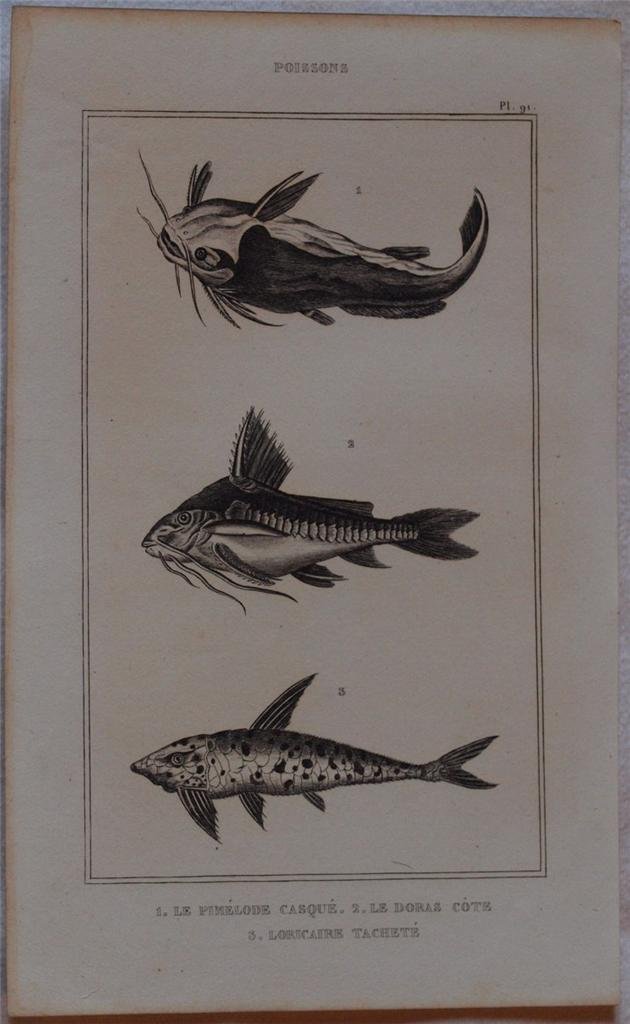 Bella incisione probabilmente della metà del XIX secolo tratta dalla monumentale opera di storia naturale di Buffon, carta spessa. L'incisione rappresenta alcun specie di pesci: il pimelodus huscutatus, Loricaria maculata. In buone condizioni, fioriture. Usure al margine sinistro. TECNICA: Incisione DIMENSIONI FOGLIO: cm 20x12,5 DIMENSIONI INCISIONE: cm 14x9 EPOCA: 1850 circa. Nice engraving of probably half of the XIX century, taken from the monumental work of natural history by Buffon, wide paper. The engraving represents some species of fishes as il pimelodus huscutatus, Loricaria maculata. In good conditions, foxings. Wearings in the left edge. TECHNIQUE: Print LEAF SIZE: cm 20x12,5 PRINT'S SIZE: cm 14x9 PERIOD: 1850 circa