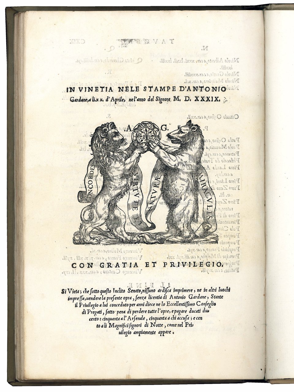First edition, second issue with Gardane's address and his beautiful large typographical device. The first issue is dated November 1538 and bears neither address nor device. For this second issue the bi-folium GG1-GG4 was reset.