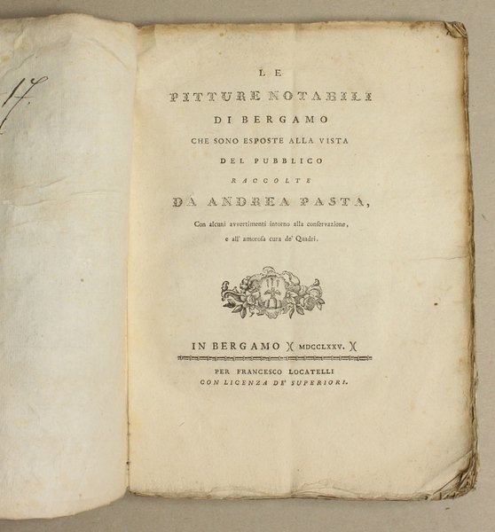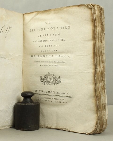 Prima edizione di questa minuziosa descrizione e storia dei dipinti che si trovano nei maggiori luoghi pubblici (sacri e non) di Bergamo. L'opera, che il Cicognara giudica "benissimo eseguita da un ottimo conoscitore", Š lodata pure dallo Schlosser che, oltre all'aspetto documentario, sottolinea l'importanza del discorso introduttivo sulla conservazione dei quadri, "una delle pi— antiche testimonianze" su questo fondamentale problema.