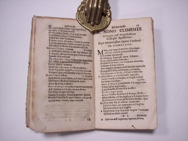 Cm. 14,5 x 8; pp. 94, 1 c. bianca; legatura coeva in tutta pelle con fregi oro al dorso e ai piatti; qualche fregio xilografico.<BR>Pelle un po' sciupata e fregi parzialmente cancellati; manca la prima carta di guardia; cerniere lente; un foro di tarlo nel margine inf. delle pagine non lede il testo; piccola macchia d'inchiostro sul taglio di alcune pp.; talloncino di biblioteca privata al dorso.<BR>Non comune, in condizioni discrete.<BR>Poeta beneventano vissuto a lungo a Roma dove godette dei favori dei Colonna. Si ricorda di lui in particolare la sua veemenza, e tra le opere si ricorda l'ode per l'assunzione al pontificato di Clemente IX.