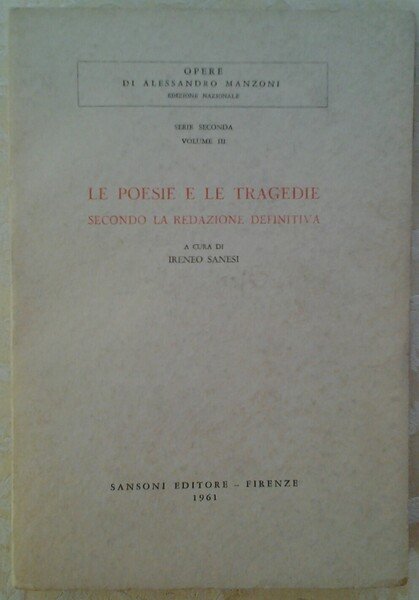 Sansoni, 1961. In - 8, brossura, pp. CXXXVI,315. Collana Opere di Alessandro Manzoni. Edizione Nazionale. In buono stato