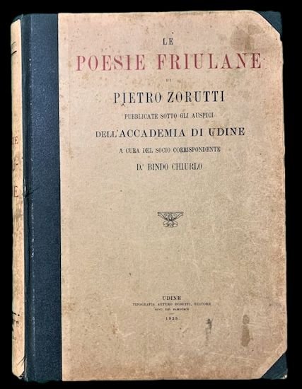 In folio (30,5x21,5 cm); IX, (1), 670 pp. Legatura editoriale in mezza tela foderata con carta con titolo e autore, stampatore e anno di edizione, al piatto anteriore ed al dorso. Ritratto dell'autore in antiporta. La più completa raccolte delle poesie friulane del famoso pUDoeta originario di Dolegna del Collio (Dolenje in sloveno, Dolegne dal Cuei in friulano standard, Dolegna dal Cuei in friulano goriziano), Pietro Zorutti (Lonzano del Collio, 27 dicembre 1792 Udine, 23 febbraio 1867). Famoso per la pubblicazione di alcuni celeberrimi almanacchi lunari tra il 1821 - 1867 nei quali pubblicava i suoi componimenti poetici ironici e solitamente a tema naturalistico, in vernacolo friulano, l'autore è da sempre considerato come colui che meglio di ogni altro ha saputo rappresentare in forma letteraria la vita della gente friulana. I suoi componimenti si avvicinano ad una sensibilità romantica e furono ampiamente lodati ad esempio da Carducci e Tommaseo. In particolare a lui si deve il merito di aver fatto del dialetto friualno, dopo Ermes di Colloredo, una lingua letteraria di primissimo piano. Esemplare in buone-ottime condizioni di conservazione.