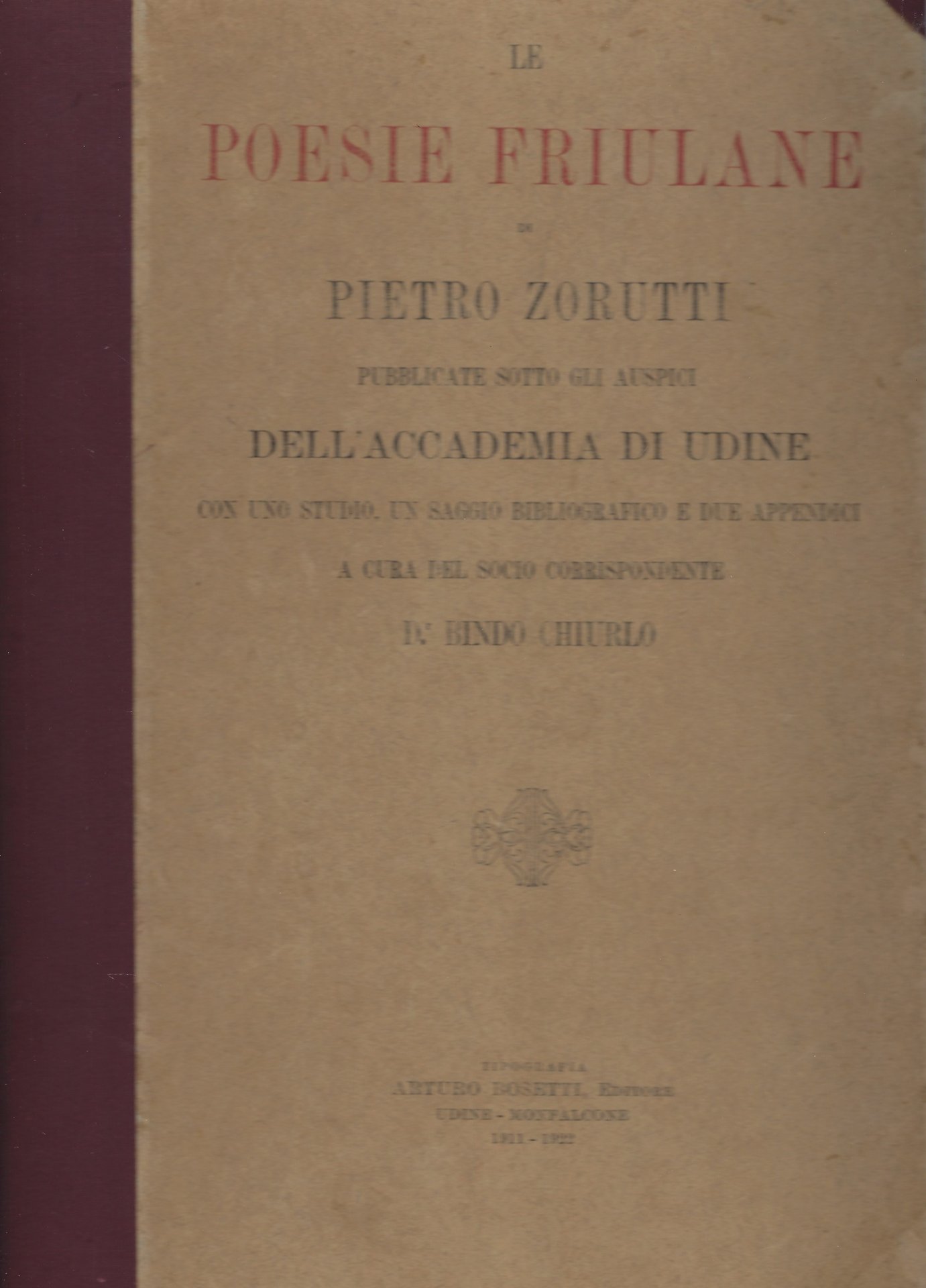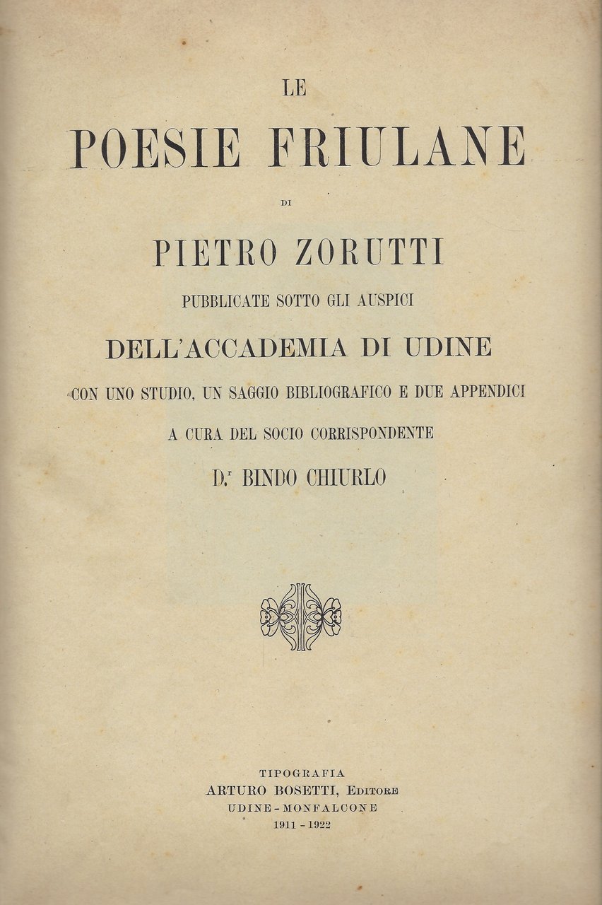 Poesie friulane pubblicate sotto gli auspici dell'Accademia di Udine con uno studio, un saggio bibliografico e due appendici a cura del socio corrispondente Dott. Bindo Chiurlo.