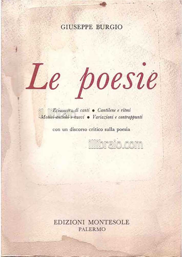 in 8°; pp. 144 + 2 tavv. (ill. in bn.); br. Primavera di canti - Cantilene e ritmi - Motivi antichi e nuovi - Variazioni e contrappunti. Con un discorso critico sulla poesia (leggeri aloni di umidità)