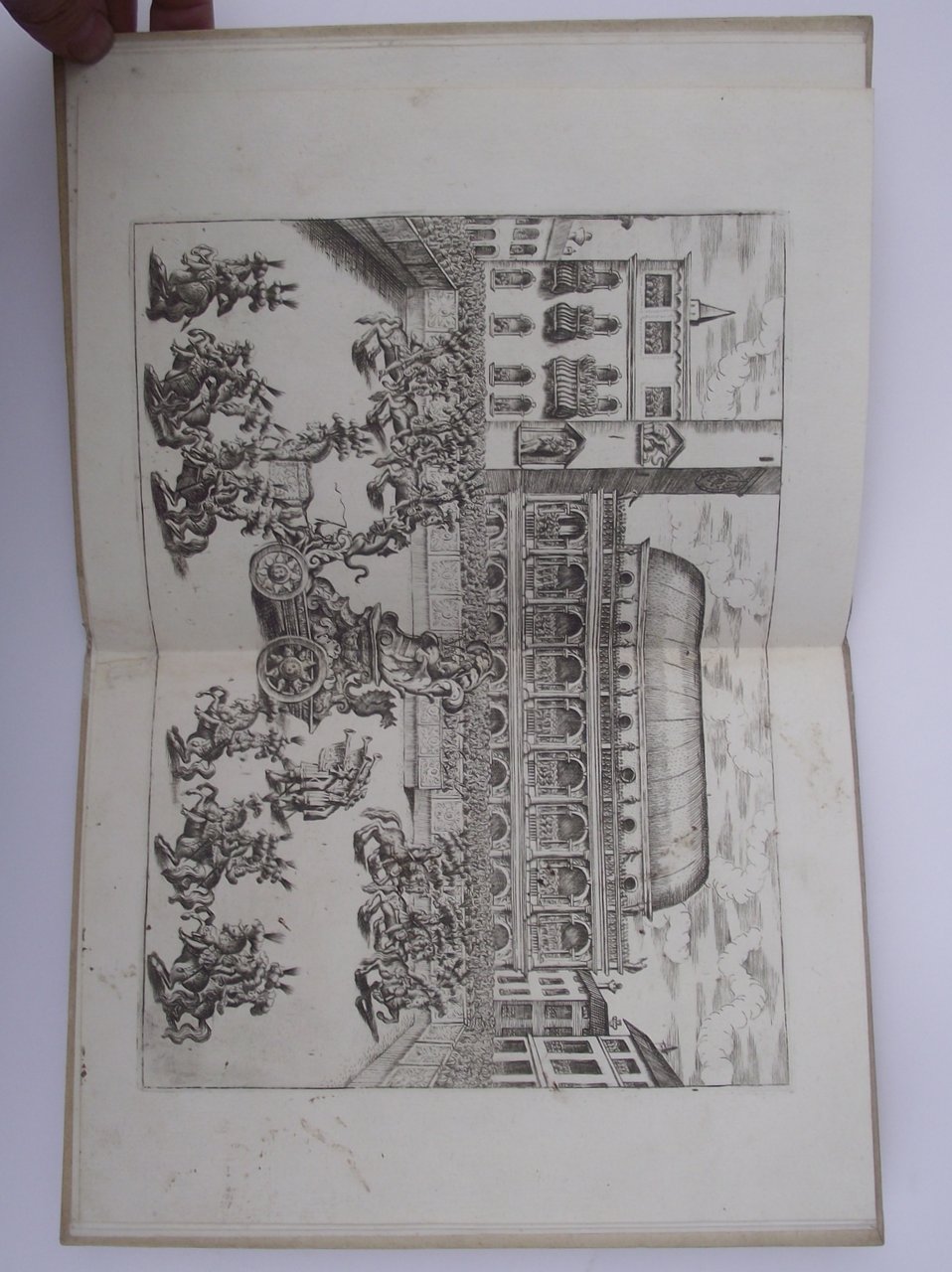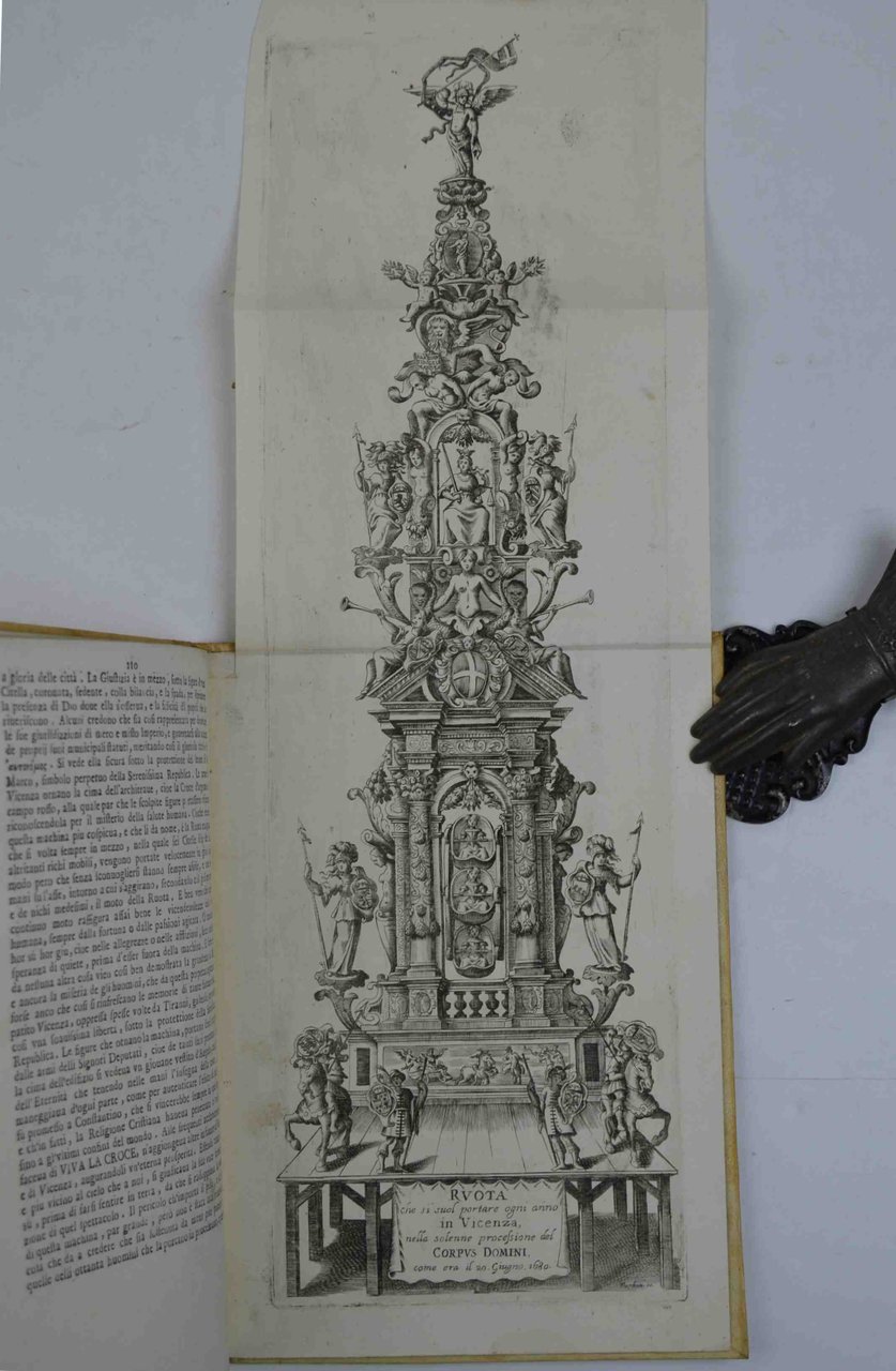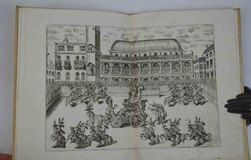 Cm. 23,5, pp. 91-113 (1). Con un fregio al frontespizio, alcune testate e figure di monete nel testo e tre interessanti tavole ripiegate fuori testo. Affascinante legatura del tempo in piena pergamena semirigida con piatti inquadrati da doppio filetto dorato e fregi agli angoli. Leggermente corto il margine superiore, peraltro bell'esemplare, in ottimo stato di conservazione e senza difetti alle tavole ripiegate (lavato?). Volume che celebra la ricorrenza in cui la città di Vicenza festeggia il Corpus Domini. Le prime due tavole raffigurano il carro allegorico ed il torneo nella splendida cornice di Piazza dei Signori; la terza illustra la "rua" o meglio la "ruota che si suol portare ogni anno in Vicenza nella solenne processione del Corpus Domini come era il 20. Giugno 1680". Tutte le bibliografie ormai concordano nell'affermare che, nonostante la paginazione dell'opera, quest'ultima possiede carattere assolutamente autonomo e fu stampata come estratto delle opere di Patin (prevalentemente di interesse medico). Cfr. Ruggieri 821 che presenta l'intera opera di Patin.