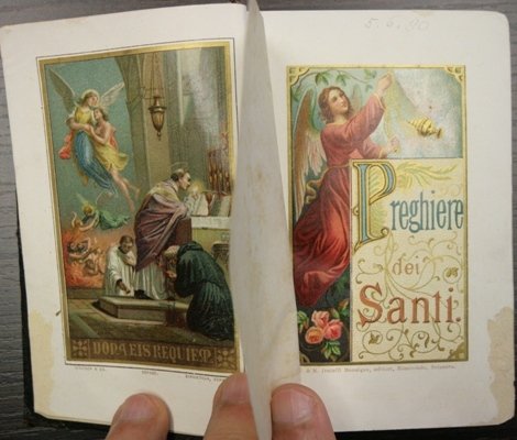 In condizioni straordinariamente ottime, vista l'età, è rilegato in pelle decorata a sbalzo ed ha un cofanetto protettivo in tela con decoro floreale; pag 512 variamente decorate ed in perfetto stato. Cm 9x12.