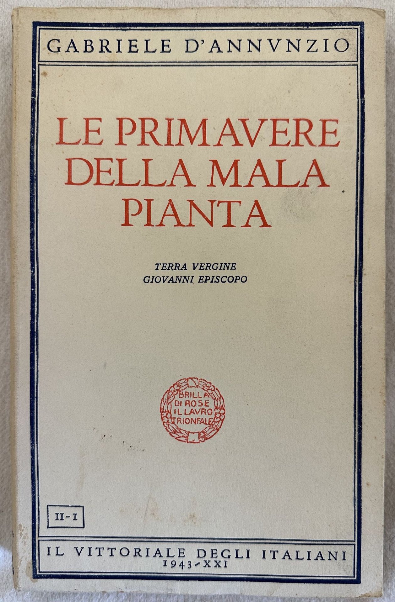 Edizione del 1943 di questa raccolta di due famose opere dello scrittore, poeta, drammaturgo, politico e gionalista Gabriele D'Annunzio (1863-1938).Il primo "Terra vergine" pubblicato per la prima volta nel 1882 è una raccolta di racconti ambientati in Abruzzo."Giovanni Episcopo" è il secondo romanzo di D'Annunzio pubblicato per la prima volta nel 1892. In buone condizioni. Copertina editoriale in buone condizioni generali con lievi usure ai margini e dorso. Legatura in buone condizioni. All'interno le pagine si presentano in ottime condizioni con rare fioriture. In barbe. In 8. Dim. 21x13,5 cm. Pp. (2)+224+(1).Edition of 1943 of this collection of two famous works written by the italian writer, poet, dramawriter, politician and journalist Gabriele D'Annunzio (1863-1938). The first one "Terra vergine" published for the first time in 1882 is a collection of tales placed in Abruzzo."Giovanni Episcopo" is the second novel written by D'Annunzio published for the first time in 1892. In good conditions. Editorial cover in good general conditions lightly worn in the extremities. Binding in good conditions. Inside pages are in very good conditions with occasional foxing. In barbe. In 8. Dim. 21x13,5 cm. Pp. (2)+224+(1).