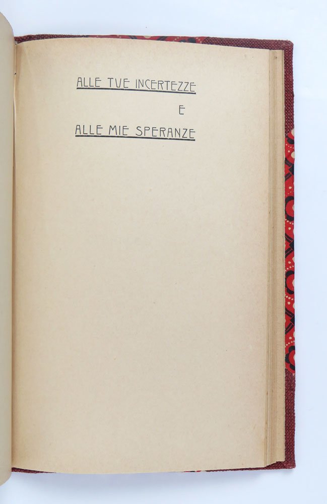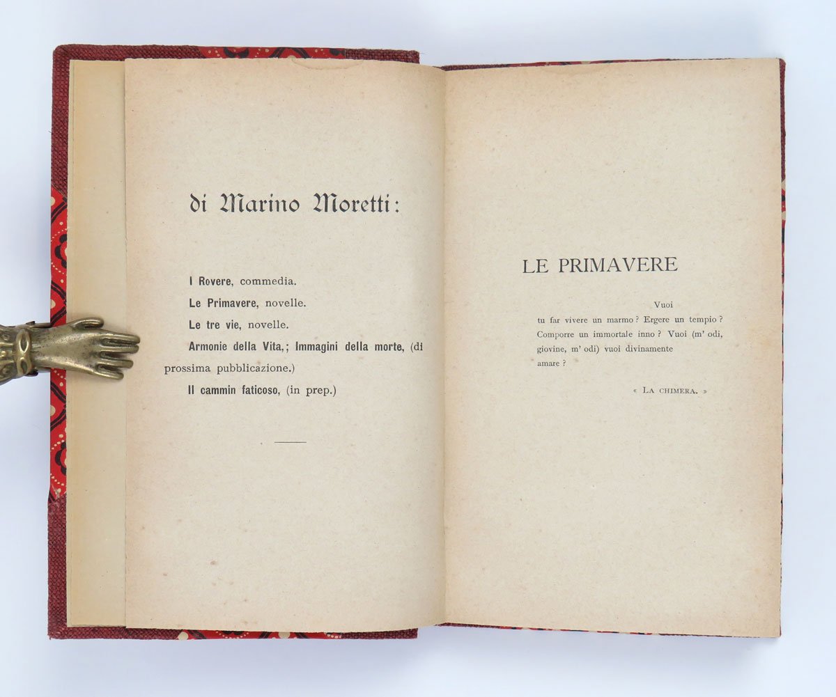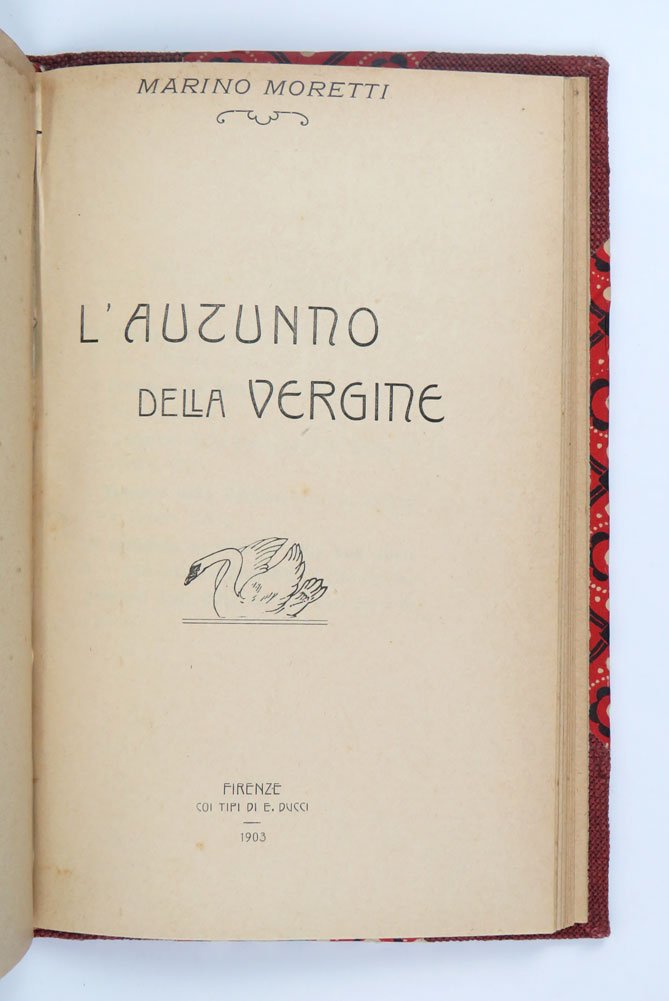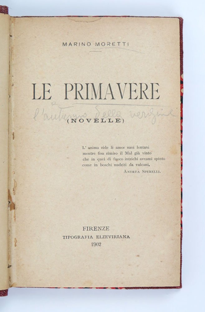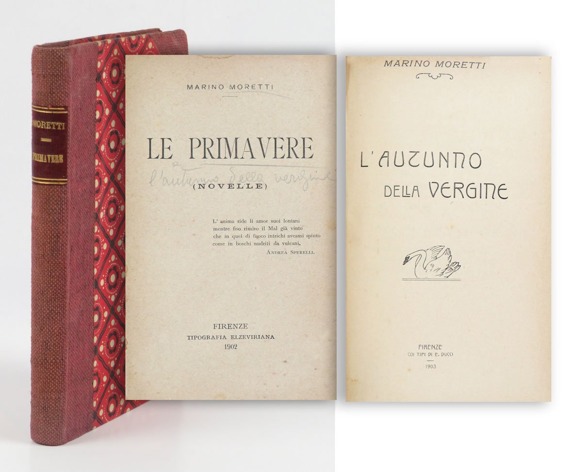 LIBROEdizioni originali.Più che buon esemplare in modesta legatura d’epoca (non presenti le copertine originali), lievemente smarginato e con le carte uniformemente brunite; qualche occasionale lieve gora marginale, ma complessivamente pulito.Le rarissime opere d’esordio di Marino Moretti impresse a proprie spese, qui presentate riunite in un unico volume con legatura d’epoca. Insieme alla raccolta di novelle del 1902 «Le Primavere», questo straordinario documento conserva infatti la silloge poetica «L’Autunno della Vergine», comparsa nel 1903 come ultima parte del trittico completato dalle plaquettes – pubblicate nello stesso anno e sempre per i tipi di Eduardo Ducci - «Il Poema di un’Armonia» e «La Sorgente della Pace». Risalenti al periodo in cui Moretti, allora appena diciottenne, frequentava la Scuola di Recitazione “Tomasso Salvini” di Firenze diretta da Luigi Rasi (luogo in cui sarebbe nata la fraterna amicizia con Aldo Palazzeschi), questi scritti giovanili rimasero a lungo ignoti alla critica, con l’effettiva esistenza di «L’Autunno della Vergine» messa in discussione fino alla fine degli anni Settanta (Cfr. Gambetti-Vezzosi, «Rarità bibliografiche del Novecento italiano», p. 574). Un oblio comprensibile, se si considera la disaffezione dello stesso Moretti per quelle prove letterarie inaugurali ancora tanto influenzato dal primo magistero di D’Annunzio e non ancora pienamente segnate dall’incontro con la poesia di Pascoli. Scrisse a questo proposito l’autore romagnolo nel romanzo autobiografico «Via Laura» (Treves, 1931), riprendendo un ricordo collocabile all’altezza del 1902: «Fu poco dopo, a Firenze, ch’io sentii fare il nome del Pascoli da qualcuno che non amava affatto il D’Annunzio […]. Ma io che credevo il mondo ormai tutto soggetto alla vecchia villa toscana non potevo ammettere nulla, al di là del dannunzianesimo, che non fosse meschino e un po’ goffo, della stessa goffaggine delle rime tronche, dei vecchi metri cantanti, da libretto d’opera: e lì per lì meschino e un po’ goffo mi parve anche il nome di Pascoli in confronto al nome fin troppo bello che dava l’idea dell’arcangelo» (p. 75). Una percezione destinata a cambiare, quella su Pascoli, e a trasformarsi anzi in una “conversione” pascoliana, ben visibile nelle sue successive raccolte poetiche, a partire da «Fraternità» (Sandron, 1905) fino alle notissime «Poesie scritte col lapis» e «Poesie di tutti i giorni» (Ricciardi, 1910 e 1911).