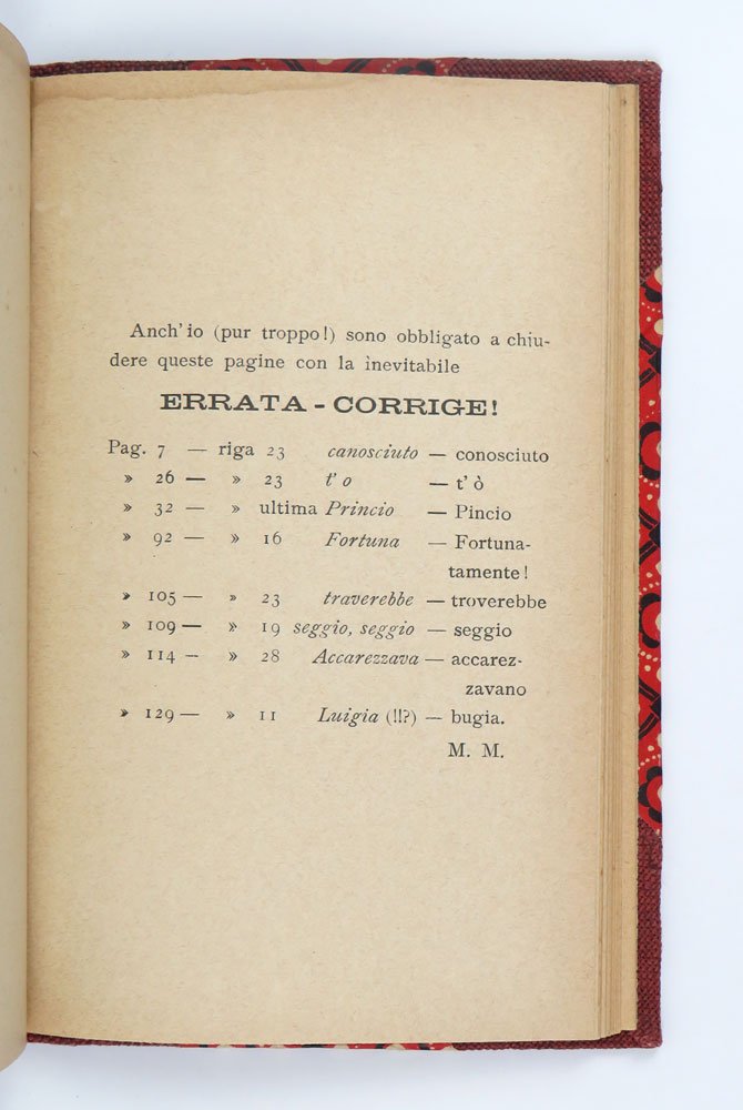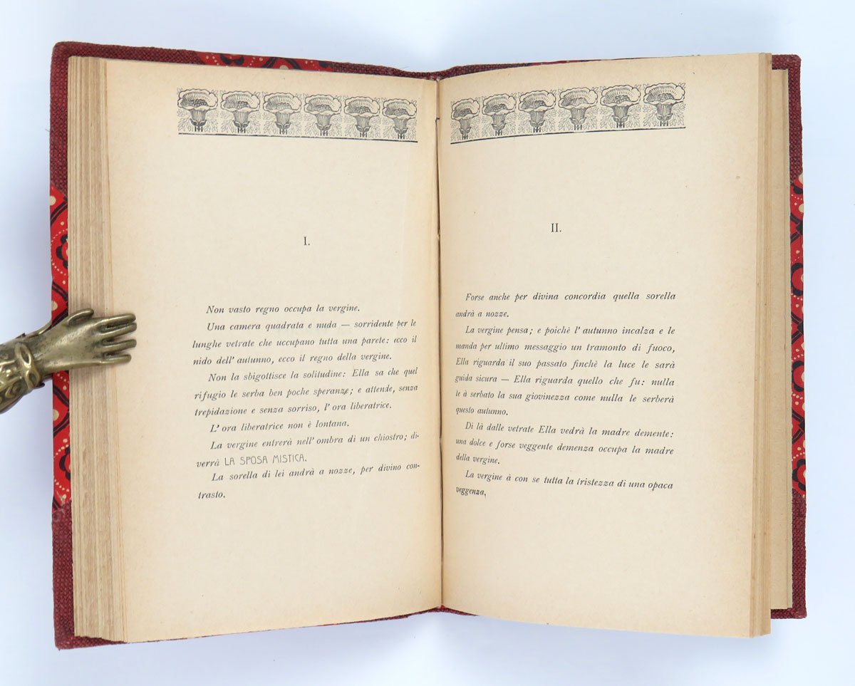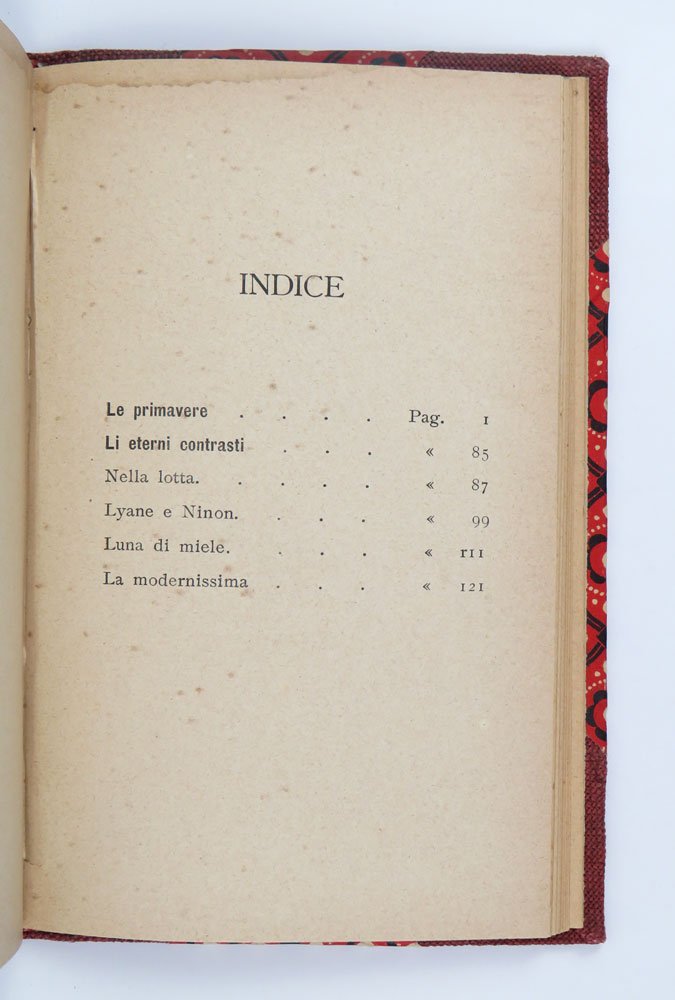 - legatura d’epoca in mezza tela bordeaux con angoli; piatti in carta decorata in nero e bianco su fondo rosso; tassello in marocchino rosso con titolo in oro sul dorso (solo «Primavere»);