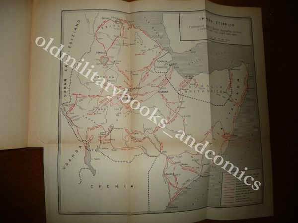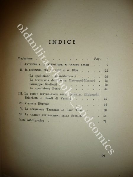 DESCRIZIONE: SOCIETA' ITALIANA D'ARTI GRAFICHE ROMA 1937 I^ Ed., br. ed. con alette pp. 79 con num. ill. f/t ed una carta rip. f.t. in 8° p. Capitoli dedicati ad Antinori, Gessi, Matteucci, Massari, Giulietti, Porro, Bottego. uno spazio alle prime spedizioni in Somalia per opera di Ribecchi-Bricchetti e Baudi di Vesme. Indice completo in foto a fine inserzione. CONDIZIONI: Perfetto, interni bianchissimi. PESO / WEIGHT: 159 gr. without package