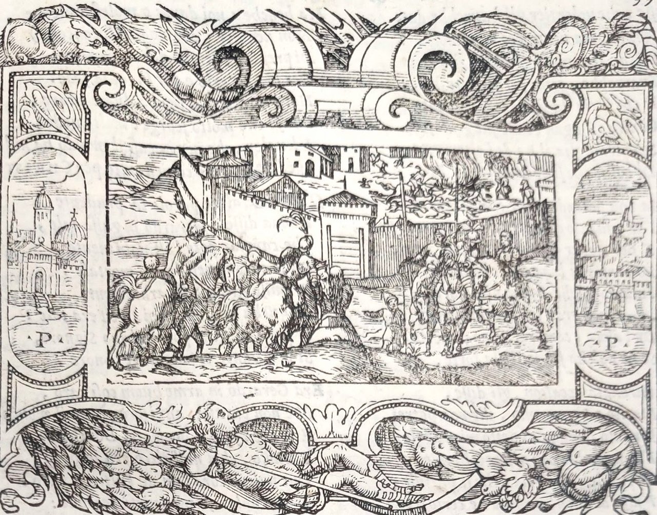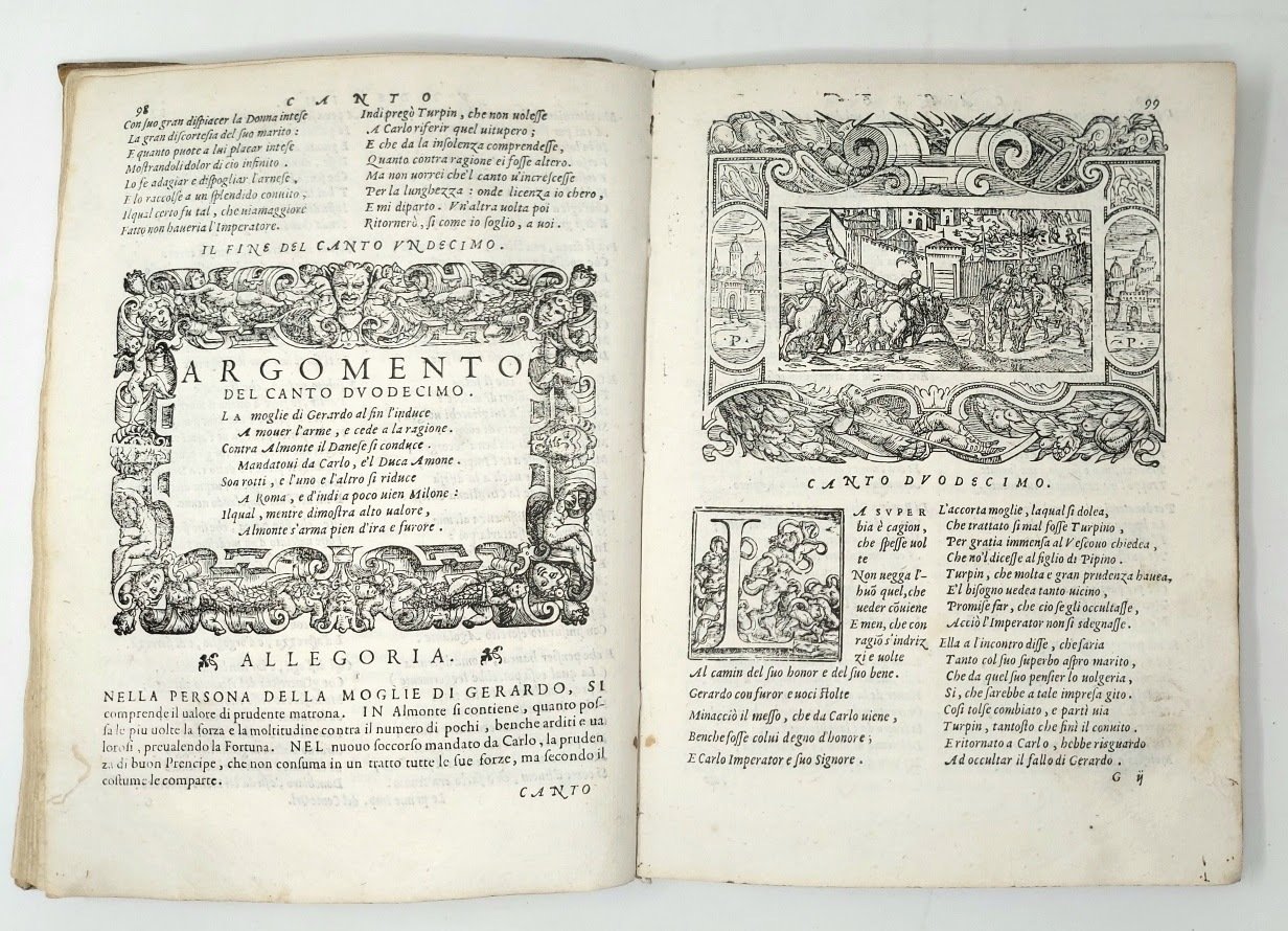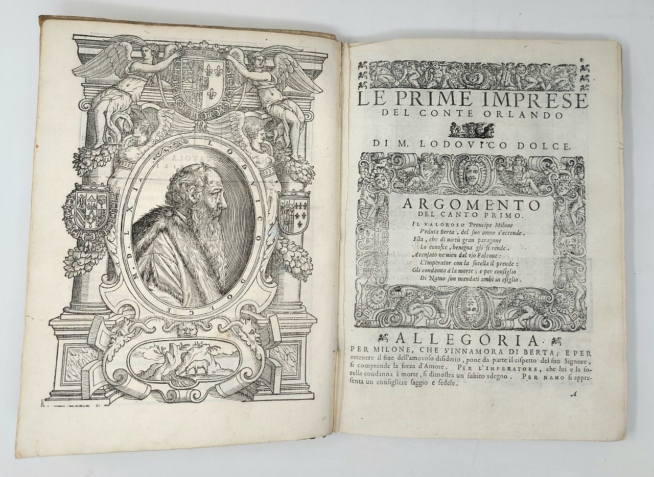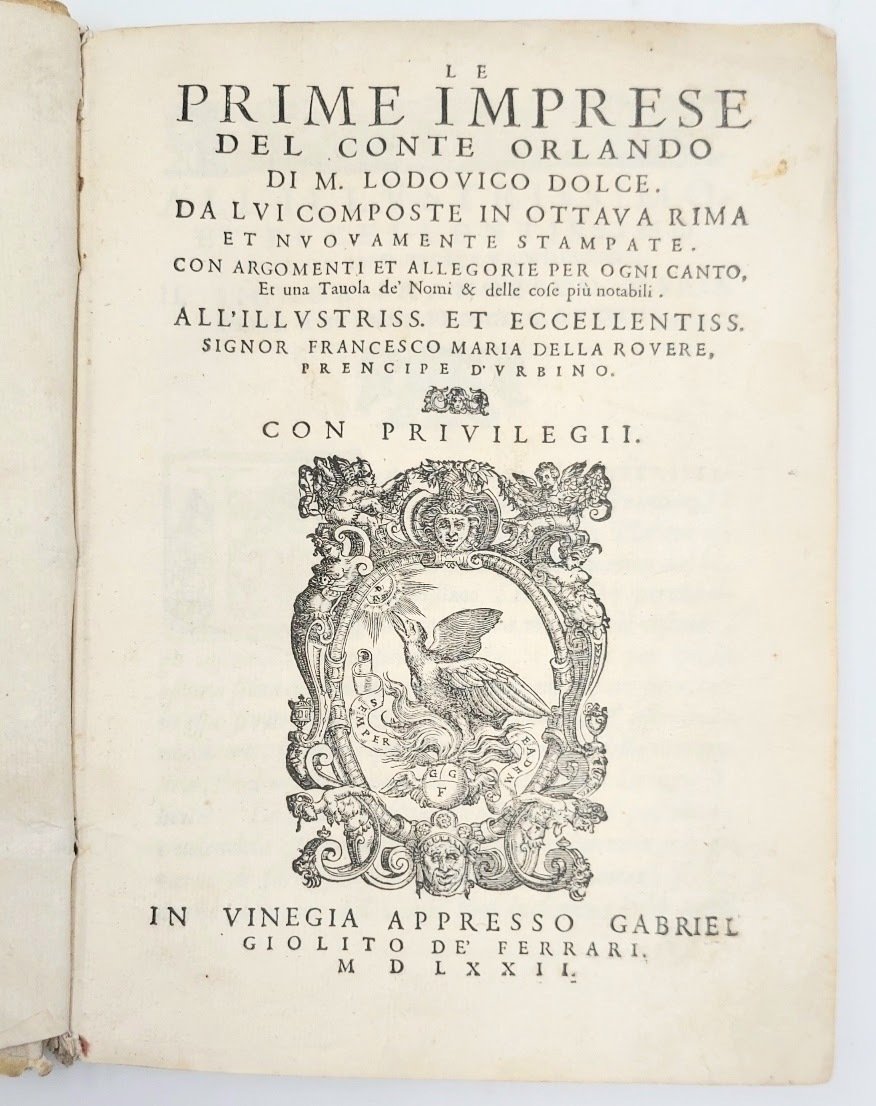 >in-8 grande (220x160 mm) pp. (16), 212, caratt. corsivo su due colonne. Legatura coeva in piena pergamena floscia, titolo ms. al dorso e al taglio inferiore (antico rinforzo in pergamena di 5cm ca. alla cuffia inferiore). Rimarchevole e ricca illustrazione in xilografia: grande impresa tipografica della Fenice sul titolo, ritratto del Dolce in larga bordura figurata, 25 scene su un terzo di pagina, entro eleganti bordure figurate, bordura all'argomento di ciascun canto, iniziali e fregi. Prima edizione, postuma, di questo poema epico-cavalleresco in ottava rima che si inserì nel ciclo letterario ispirato dall'Ariosto. Rara. Il Dolce produsse, tutti pubblicati da Giolito, altri poemi con protagonisti Ercole, Ulisse, Achille ed Enea. Esemplare molto bello, a grande di margini, nella sua legatura originale (foro di tarlo marginale anticamente restaurato su alcune carte, e tracce di forellino nelle poche seguenti). Bongi, Annali, II, 323-324: ''l'edizione del 1572 è effettivamente rara e di prezzo in commercio''.. Melzi, Bibliogr. dei romazi e poemi cavallereschi, n.130. Adams, D-744. Non in Mortimer.