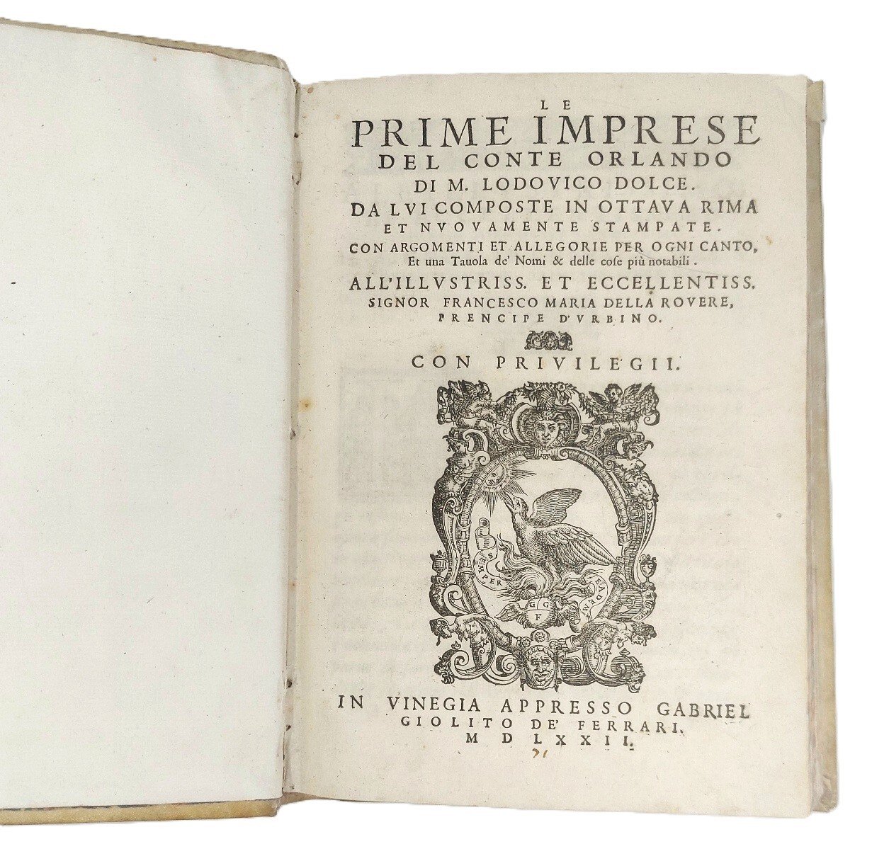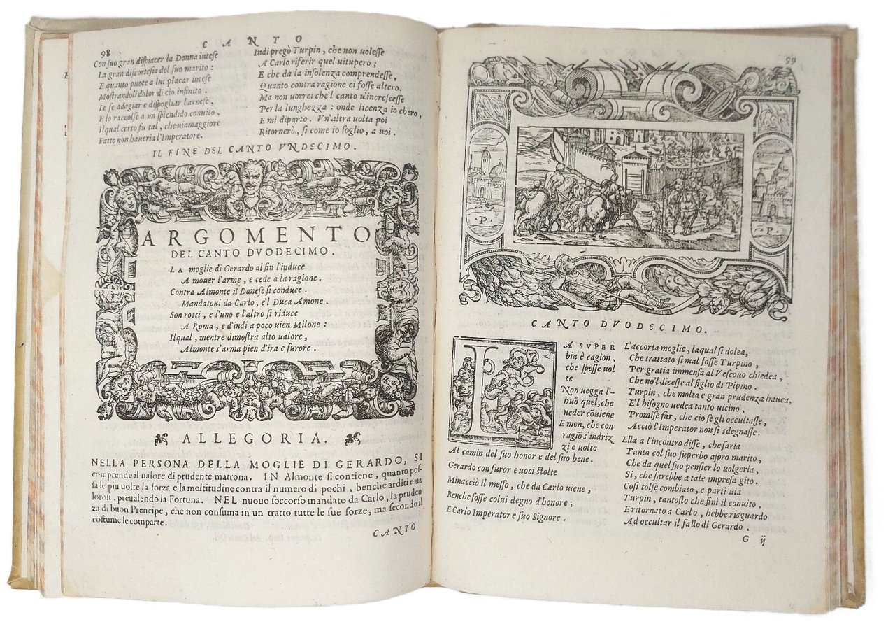 >in-8 grande, pp.(16), 212, leg. coeva p. pergamena, titolo e fregi in oro al dorso. Caratt. tondo e corsivo, grande impresa di Giolito sul foglio di titolo, ritratto a piena pag. di Dolce, 25 illustrazioni su mezza pag. racchiuse in bordura istoriata, gli Argomenti entro altra bordura fig., grandi capilettera istoriati, fregi vari, il tutto in silografia. Prima edizione, dedicata al Principe di Urbino F.M. della Rovere, stupendamente impressa e illustrata, di un romanzo di cavalleria fra i più noti e pregiati, che narra in 25 canti in versi le epiche gesta e la saga del paladino Orlando. Esemplare assai bello. Melzi p.130. Ferrario V, p.35. Bongi, II, 323-24. Adams D-744. BM Sh.T., 221.