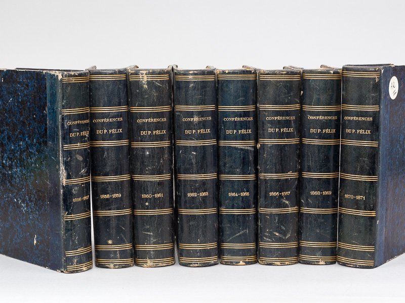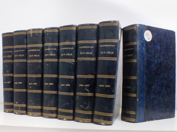 Rappel du titre complet : Le Progrès par le Christianisme. Conférences de Notre-Dame de Paris. (16 années en 8 Volumes) Années 1856 - 1857 - 1858 - 1859 - 1860 - 1861 - 1862 - 1863 - 1864 - 1865 - 1866 - 1867 - 1868 (Le progre?s par la religion) - 1869 (Le progre?s par l'E?glise) - 1870 (Le progre? par l'autorite? de l'E?glise) - 1871 (De la maternite? de l'E?glise) Rare exemplaire de la série suivie complète des conférences du Père Félix à Notre-Dame, consacrées au progrès par le christianisme. Etat très satisfaisant (anciens cachets d'institution religieuse, étiquette de cote en faux-titre et en mors, dos un peu frottés avec qq. épidermures). Rare ensemble.