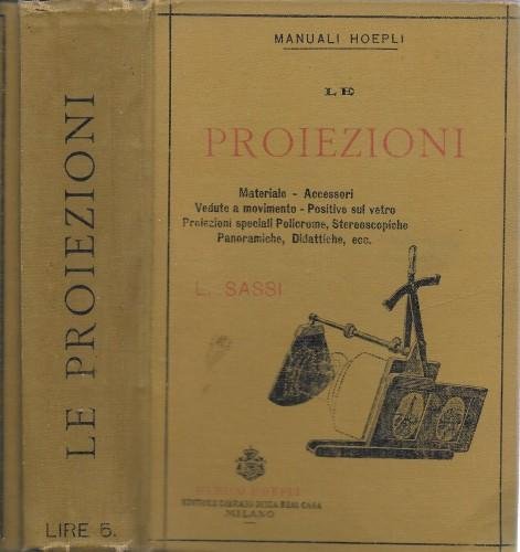 prima ediz., in 16°, pp. XVI, 447, 1 b., 64 di catalogo edit., 4; p/tela edit. senape con tit. in rosso e fregi in nero, tagli rossi. Materiale - Accessori - Vedute a movimento - Positive sul vetro - Proiezioni speciali policrome, stereoscopiche, panoramiche, didattiche etc. Con 141 incisioni. Lievi sporadiche fior., buon esemplare. Raro. 593/38