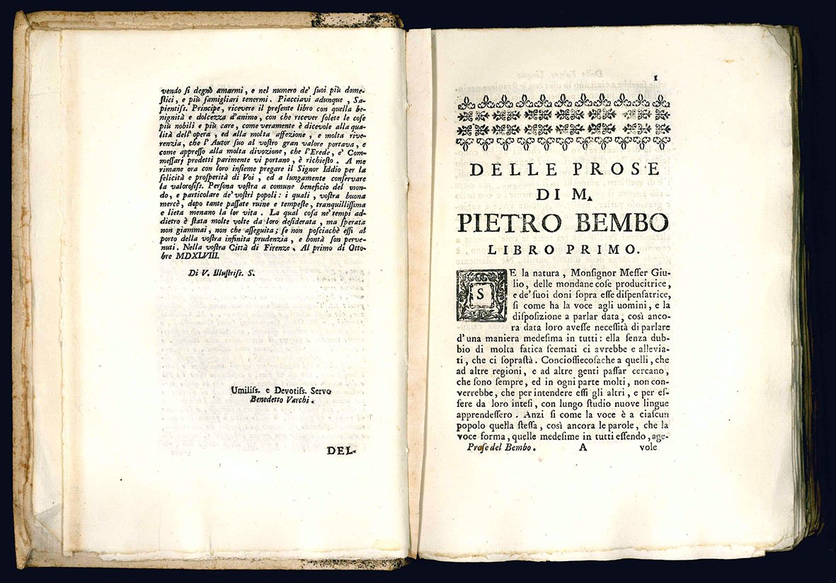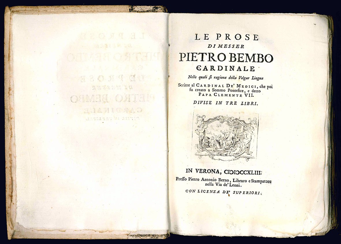 Le prose di messer Pietro Bembo cardinale. Nelle quali si ragiona della Volgar Lingua. Scritte al Cardinal De' Medici, che poi fu creato a Sommo Pontefice, e detto Papa Clemente VII. Divise in tre libri.