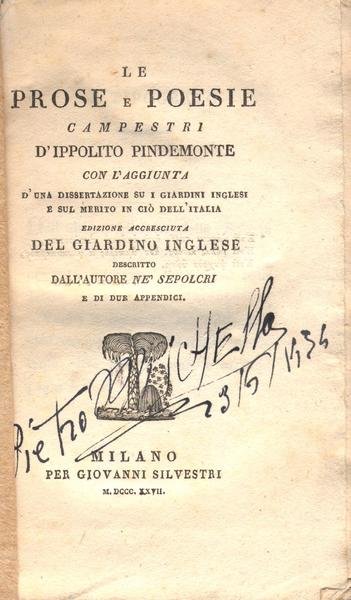 CON L'AGGIUNTA D'UNA DISSERTAZIONE SU I GIARDINI INGLESI. MILANO GIOVANNI SILVESTRI 1827. Brossura Cm. 17 X 11, pag. 232, più canzoni pastorali di Girolamo Pompei pag. 124 (VEDI foto apertura libro nella presente scheda). BUONO stato