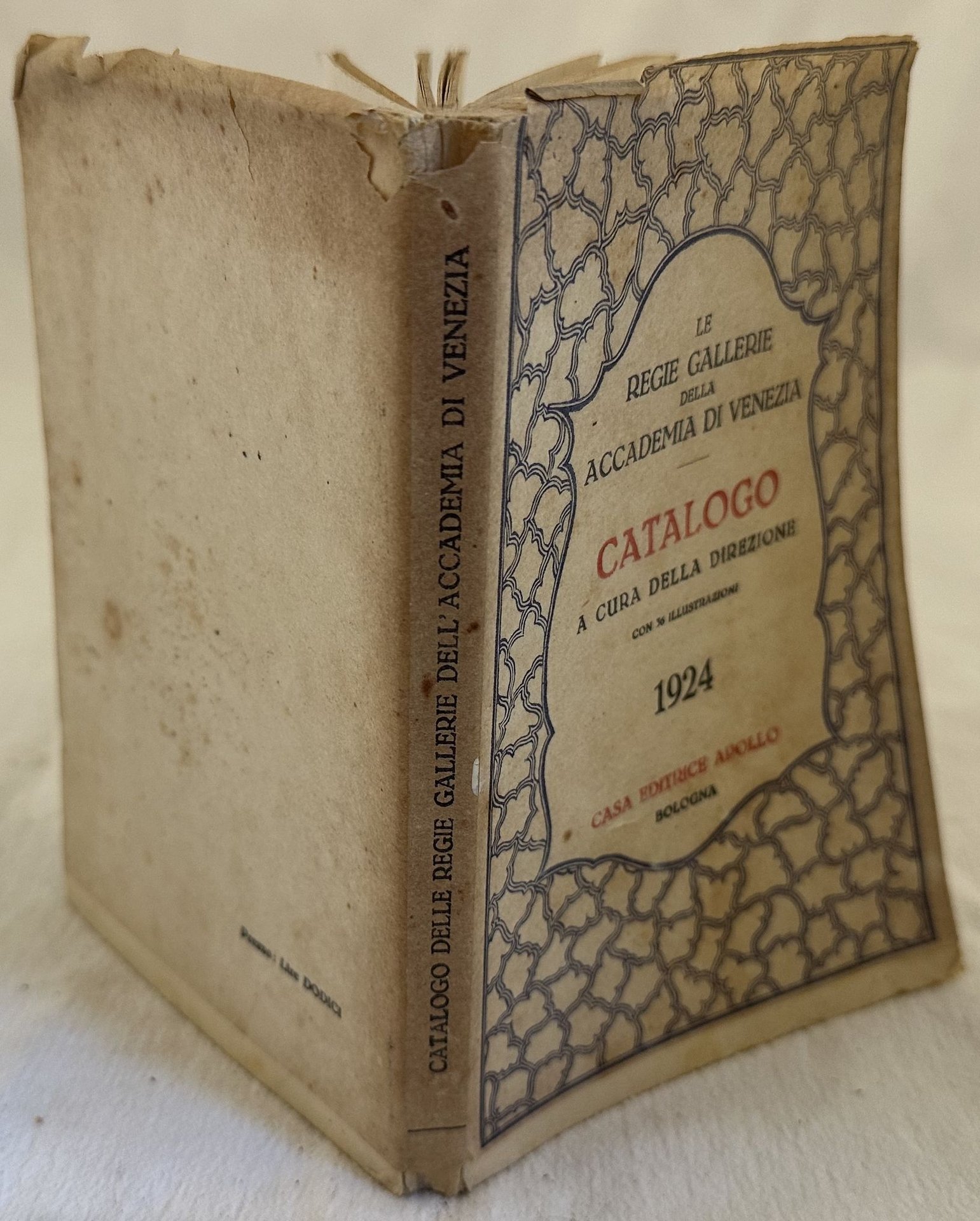 Edizione del 1924 di questo catalogo delle Regie Gallerie dell'Accademia di Venezia. Nella prima parte lista delle opere esposte con relativa descrizione e talvolta indicazione della provenienza. Alla fine 36 tavole fotografiche. In buone condizioni. Copertina editoriale in buone condizioni generali con lievi usure ai margini e dorso. Legatura in buone condizioni. Pagine in buone condizioni con rare fioriture. In 8. cm 19x12. Pp. 178+(2)+(36)+(10) Edition of 1924 of this catalogue of Regie Gallerie dell'Accademia in Venezia. In the first part list of works with relating description and indication of provenance. At the end 36 photographic plates. In good conditions. Editorial cover in good conditions lightly worn in the extremities. Binding in good conditions. Pages in good conditions with occasional foxing. In 8. cm 19x12. Pp. 178+(2)+(36)+(10)