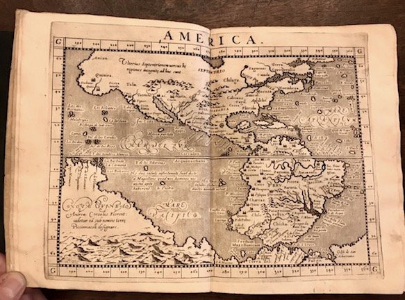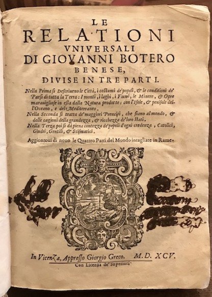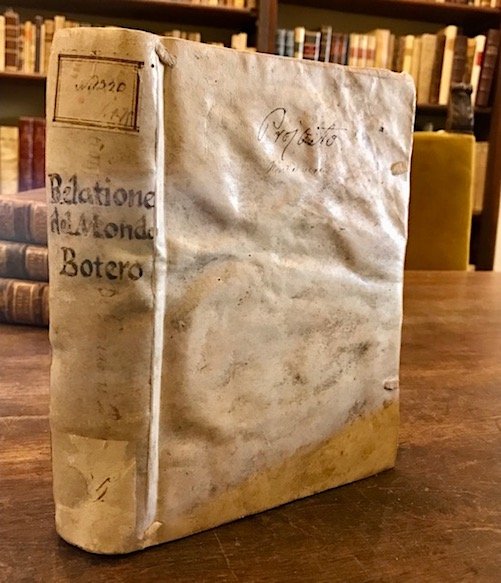 8vo (cm. 20), tre Parti in un volume (ciascuna con proprio frontespizio); 4 cc.nn., 295(1) pp.; 10 cc.nn., 152 pp.; 183(1), 4 cc.nn. Con 4 carte geografiche a doppia pagina raffiguranti l’Europa, l’Africa, l’Asia e l’America. Legatura coeva in pergamena floscia con titolo ms. al ds. (tracce di legacci). Antico ex libris manoscritto sulla carta di guardia libera anteriore. Firme di appartenenza anticamente cassate al frontespizio con inchiostro bruno che ha provocato delle piccole mancanze per corrosione. Lievi tracce di inchiostro non invasive anche sulla seconda e terza carta. Salvo questo difetto segnalato, esemplare assai fresco ed in ottimo stato di conservazione con le carte geografiche - posizionate ad inizio volume - in nitida e forte impressione. Le ‘Relationi Universali’, pubblicate a più riprese tra il 1591 ed il 1596 e poi nel corso di tutto il XVII Secolo, sono una vastissima raccolta di notizie geografiche, storiche, religiose, culturali, economiche e politiche su tutte le parti del mondo allora conosciuto. Di particolare interesse il quarto Libro della prima Parte che riguarda il ‘Mondo Nuovo’.