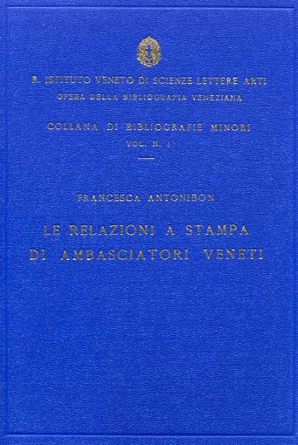 Esauriente bibliogr.con indice alfabet.per nome degli Ambasciat.e dei dati relativi alle relaz.da loro compilate. Padova, Reale Ist.Veneto di Scienze, Lettere ed Arti 1939, cm.17x24, pp.152, legatura editoriale in tutta tela, titoli in oro al piatto anteriore e dorso. Coll.Varie e Atti di Convegni. Coll.di Bibliografie Minori,1. STATO: USATO, COME NUOVO.