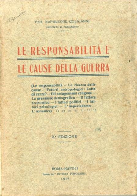 2. ed. 246 p. ; 19 x 14 cm. Sommario: Le responsabilità; La ricerca delle cause; Fattori antropologici: Lotta di razze ?; Gli antagonismi religiosi; La pressione demografica; Il fattore economico; I fattori politici; I fattori psicologici; L'Imperialismo; L'avvenire. Napoleone Colajanni, politico e un saggista d'origine siciliana, è stato un protagonista della vita politica e culturale italiana a tra la fine dell'Ottocento e i primi del Novecento. Sostenne l'intervento dell'Italia nella Prima guerra mondiale e durante tutti gli anni del conflitto condusse una ininterrotta campagna contro i "sabotatori interni", tra i quali coinvolse aspramente i socialisti italiani. Particolarmente critico egli fu, dopo il 1917, nei confronti del bolscevismo, ricollegandosi in questa contestazione alle posizioni del Mazzini "contro la Comune di Parigi, infinitamente meno pericolosa e meno bestiale del regime bolscevico". . Brossura editoriale, coperta in cartoncino flessibile, titolo impresso in rosso al piatto e in azzurro al dorso. Mende al dorso, pagine interne leggermente imbrunite, firma di appartenenza nel frontespizio e nella copertina, per il resto libro integro. Codice libreria 8881.