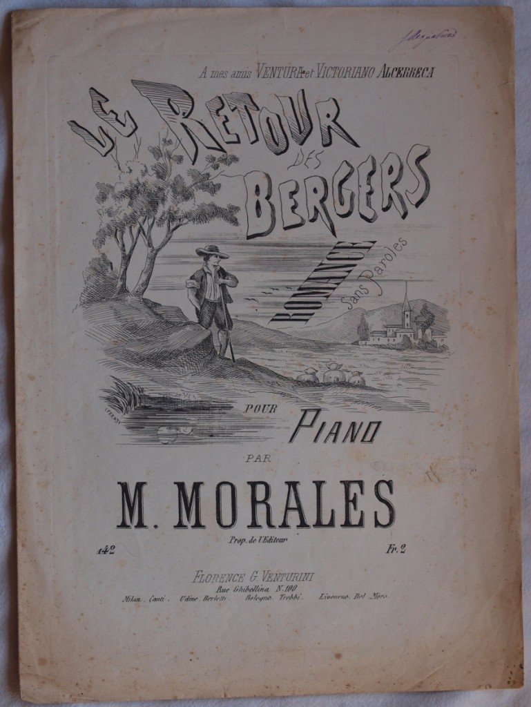 In folio. Dim. 35,5x26 cm. Pp. 5. Bellissimo spartito per pianoforte del pezzo di musica "Le retour des bergers" di Morales. Senza data ma del 1870 circa. Bella brossura editoriale decorata. In buone condizioni. Brossura editoriale in discrete condizioni generali con lievi usure ai margini e dorso. Legatura assente. All'interno le pagine si presentano in buone condizioni con rare fioriture. Beautiful musical score for piano of the piecie "Le retour des bergers" by Morales. Not dated but of around 1870. Beautiful decorated illustrated cover. In good conditions. Editorial cover in fair general conditions slightly worn in the edges, plates and spine. Binding is almost missing. Inside pages are in good conditions with foxings.