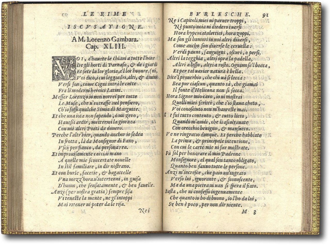 >in-8, (150x100 mm), ff. (4), 122, (1, privo dell'ultimo f. bianco), legatura d'amatore in marocchino nocciola, duplice filetto oro ai piatti, tasselli e fregi al dorso a nervi, ricche dentelle interne (firmata Bredford). Grande impresa dello stampatore al titolo, testatine ed iniziali istoriate. Prima ed unica edizione dell'unica opera organica pubblicata dal Ferrari, legato pontificio di origini modenesi. Nell'opera, divisa in 52 capitoli, sono evidenti le fonti dell'autore: Ariosto, Pulci e Folengo; le parti più interessanti della narrazione invece si individuano nell'uso dei dialetti e di altri linguaggi cui il Ferrari fa ricorso in varie occasioni, dimostrando una certa inclinazione per le combinazioni linguistiche. Un intero capitolo è composto in dialetto modenese, numerosi i passi in bergamasco e in mantovano, mentre il napoletano è adoperato per caratterizzare il tipo del cerimonioso e del millantatore, in maniera analoga a quanto avviene nella commedia contemporanea. Curiosi alcuni titoli: la pazzia, in lode alle donne brutte, in lode della poltroneria, in raccomandazione d'un libro, Contra la Barba, in lode delli Carcioffi. Provenienza: al contro piatto etichetta Pickering. Ottimo esemplare, antico ex-libris Pickering Bookseller. STC 247. ADAMS F-272