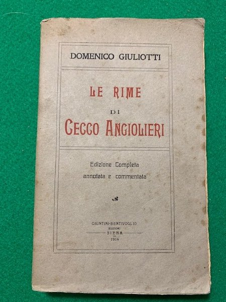 In 8°; (4), XIX, (1), 323, (3) pp. Brossura editoriale con titolo in rosso e nero impresso al piatto anteriore. Esemplare in buone condizioni di conservazione. Prima edizione con le annotazioni dello scrittore, Domenico Giuliotti (San Casciano in Val di Pesa, 18 febbraio 1877 - Greve in Chianti, 12 gennaio 1956), delle rime di Francesco Angiolieri, detto Cecco (Siena, 1260 circa - Siena, 1311/1313), poeta e scrittore italiano, contemporaneo di Dante Alighieri e appartenente alla storica casata nobiliare degli Angiolieri.