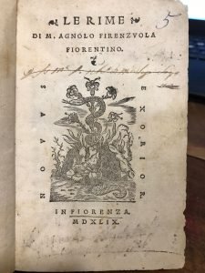 Prima edizione, postuma, delle rime di Michelangelo Gerolamo Giovannini da Firenzuola (Firenze, 28 settembre 1493 – Prato, 27 giugno 1543). Bella marca tipografica al frontespizio e al recto dell'ultima carta. Note d'epoca manoscritte e cancellate al frontespizio, una leggera brunitura alle prime 10-12 carte, per il resto ottimo esemplare. Piena pergamena cinque-seicentesca con tit. manoscritti al dorso. Pagg. 135,1. Mis mm 150x100
