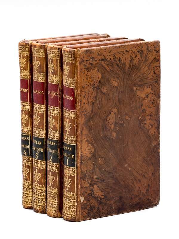 Nouvelle édition, revue et corrigée, 4 vol. in-18 reliure début XIXe pleine basane racinée, dos lisse orné, Chez L. Tenré, Paris, 1823, 265 ; 274 ; 475 ; 217 pp. avec frontispice à chaque volume Etat très satisfaisant (très petits mq. en plats, petit défaut d'origine n'affectant pas le texte à un feuillet au premier tome, des rouss.) pour ce charmant exemplaire bien relié du chef-d'oeuvre de Scarron