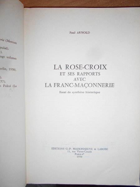 Paul, Arnold. Paris, Maissoneuve & Larose, 1970. Le Rose Croix et ses rapports avec la Franc-Maçonnerie. In-8°, br. con pellicola trasparente di protezione. 259 pp. Ben conservato. Neg. Mass. mob. 1