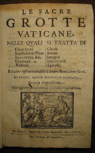 Le sacre grotte vaticane. Nelle quali si tratta di Corpi Santi, Sepolchri de’ Pont., Imperatori, Re, Cardinali, Vescovi, Chiese, Statue, Imagini, Inscrittioni, Epitaffij. E d’altre cose memorabili sì dentro Roma, come fuori. Seconda Impressione. Con aggiunta di correttione, e d’indice copiosissimo