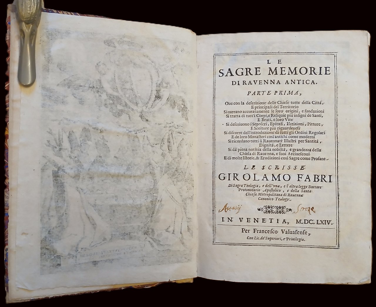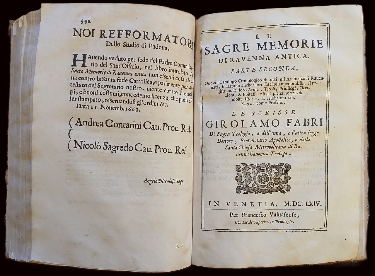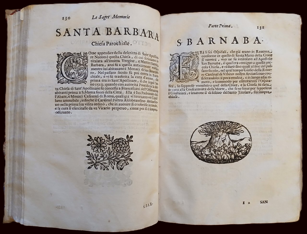 Volume in 4° antico (cm 22 x 15,5), legatura tardo ottocentesca in mezza pergamena, dorso muto con filetti a secco, carta pavone ai piatti. Prima edizione divisa in due parti con frontespizi propri, pp. complessive (32),591,(1), con bella antiporta incisa in rame e un repertorio iconografico in xilografia con fregi, capolettera e finalini ornati e figurati, 32 stemmi di vescovi e cardinali di Ravenna nel testo.