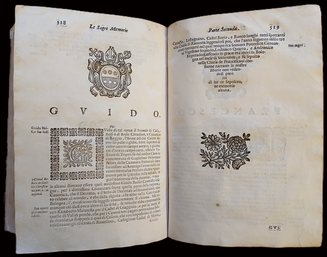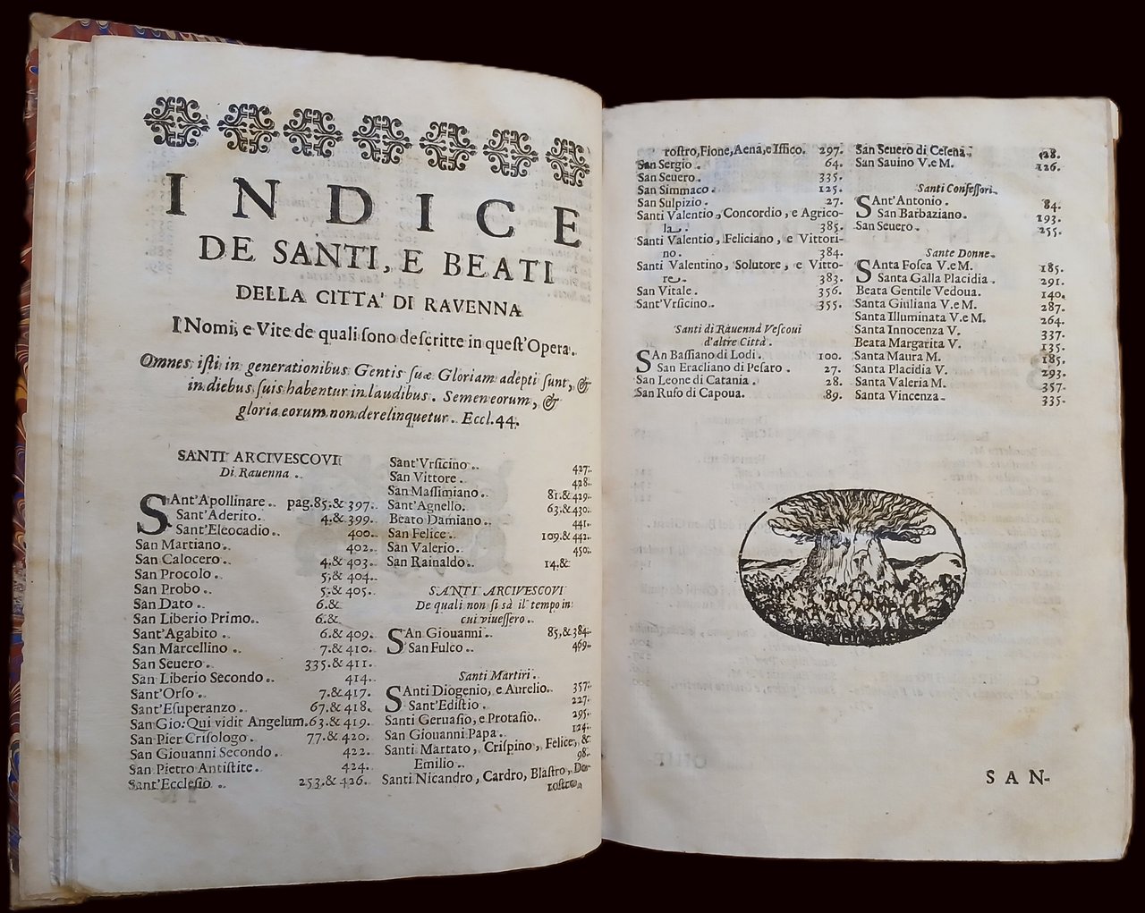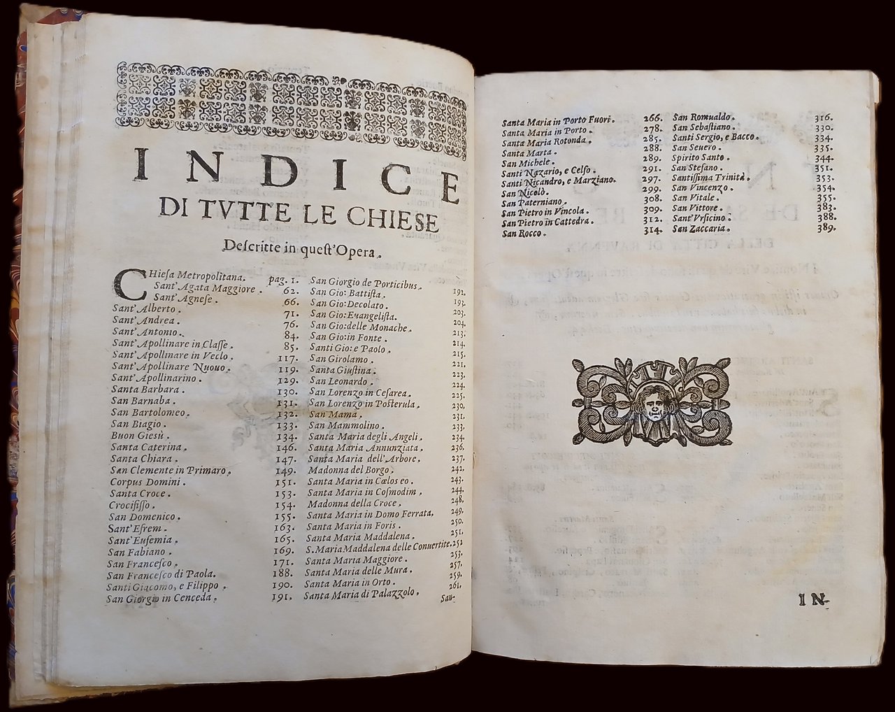 Volume in 4° antico (cm 22 x 15,5), legatura tardo ottocentesca in mezza pergamena, dorso muto con filetti a secco, carta pavone ai piatti. Prima edizione divisa in due parti con frontespizi propri, pp. complessive (32),591,(1), con bella antiporta incisa in rame e un repertorio iconografico in xilografia con fregi, capolettera e finalini ornati e figurati, 32 stemmi di vescovi e cardinali di Ravenna nel testo.