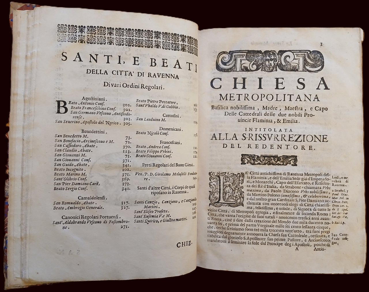 Parte prima, ove con la descrizione delle Chiese tutte della Città, e principali del Territorio, si narrano accuratamente le loro origini e fondazioni, si tratta di tutti i Corpi e le Reliquie più insigni dei Santi e Beati e loro vite, si descrivono i Sepolcri, Epitaffi, Iscrizioni, Pitture e Scolture più riguardevoli, si discorre dell’introduzione di tutti gli Ordini regolari e de loro Monasteri così antichi come moderni, si ricordano tutti li Ravennati Illustri per Santità e Dignità e Lettere, si dà piena notizia della nobiltà, e grandezza della Chiesa di Ravenna e suoi Arcivescovi e di molte Istorie & Erudizioni così sagre come Profane.