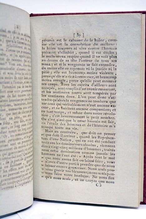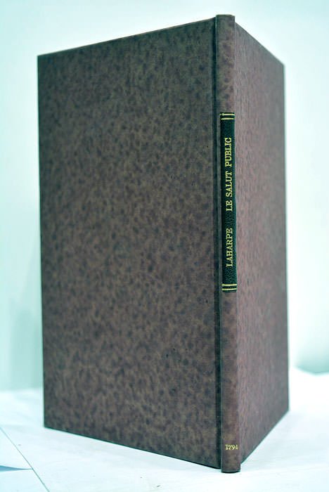 1 feuillet. 58 pages. (20x13 Cm). Cartonnage moderne à la Bradel. Dos lisse. Pièce de titre dorée. Pamphlet du célèbre littérateur Jean-François de La Harpe contre la Convention nationale. Défenseur enthousiaste des idéaux révolutionnaires à ses débuts, la Harpe se convertit ensuite au catholicisme et devint monarchiste. Rares taches et rousseurs. Bon état.