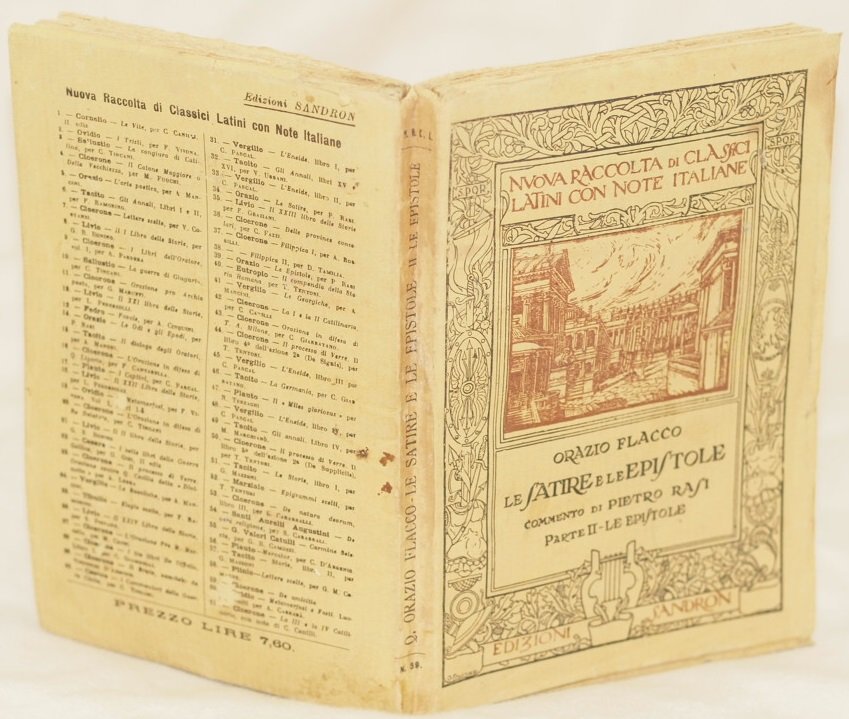 In 8. Dim. 20,5x13,5 cm. Pp. IV+228. Edizione Sandron del 1930 di questa raccolta di opere di Quinto Orazio Flacco (65 a.c.-8 a.c.). Siamo in possesso del secondo volume contenente le epistole. Testo latino con note in italiano a cura di Pietro Rasi Professore Ordinario di grammatica greca e latina nella Regia Università di Padova. Bella brossura editoriale originale. In buone condizioni. Brossura editoriale in buone condizioni generali con lievi usure ai margini, dorso e piatti. Legatura in buone condizioni. All'interno le pagine si presentano in ottime condizioni con rare fioriture. Sandron edition of 1930 of this collection of works by Quinto Orazio Flacco (65 a.c.-8 a.c.). We only have the second volume containing epistles. Latin text with notes in italian language by Pietro Rasi Ordinary teacher of greek and latin grammar in the Regia Università di Padova. Beauitful editorial original cover. In good conditions. Editorial cover in good general conditions slightly worn in the edges, spine and plates. Binding in good conditions. Inside pages are in very good conditions.