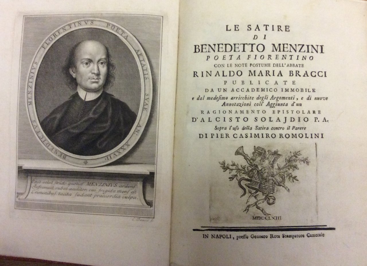 In-8 gr. (mm. 252x186), cartonato muto ottocentesco, titolo oro su tassello al dorso, pp. (2),LXXXII,465, antiporta con ritratto dell'A. in medaglione, inc. in rame da Faucci; frontespizio con bella vignetta calcografica. Questa edizione contiene XII "Satire" con le note postume dell'Abbate Rinaldo Maria Bracci, pubblicate da un Accademico Immobile' e dal medesimo arricchite degli Argomenti e di nuove Annotazioni, con l'Aggiunta d'un ragionamento epistolare d'Alcisto Solajdio P.A. sopra l'uso della Satira, contro il parere di Pier Casimiro Romolini.Cfr. Diz. degli Autori Bompiani,II, p. 722: Le "Satire" del fiorentino Benedetto Menzini (1646-1704), sempre di molto interesse, sono una violenta polemica contro i vizi del secolo, avarizia, invidia, ipocrisia, contro la corruzione familiare e contro gli avversari lacerati sanguinosamente e spesso volgarmente.Cfr. anche Gamba,669: Edizione tenuta in istima per le varie lezioni aggiuntevi, e tolte da un testo a penna.. L'"Accademico Immobile" editore di queste Satire', degli Argomenti e dell'Appendice (a p. 373) è stato il Marchese Guasco.Esemplare ben conservato.