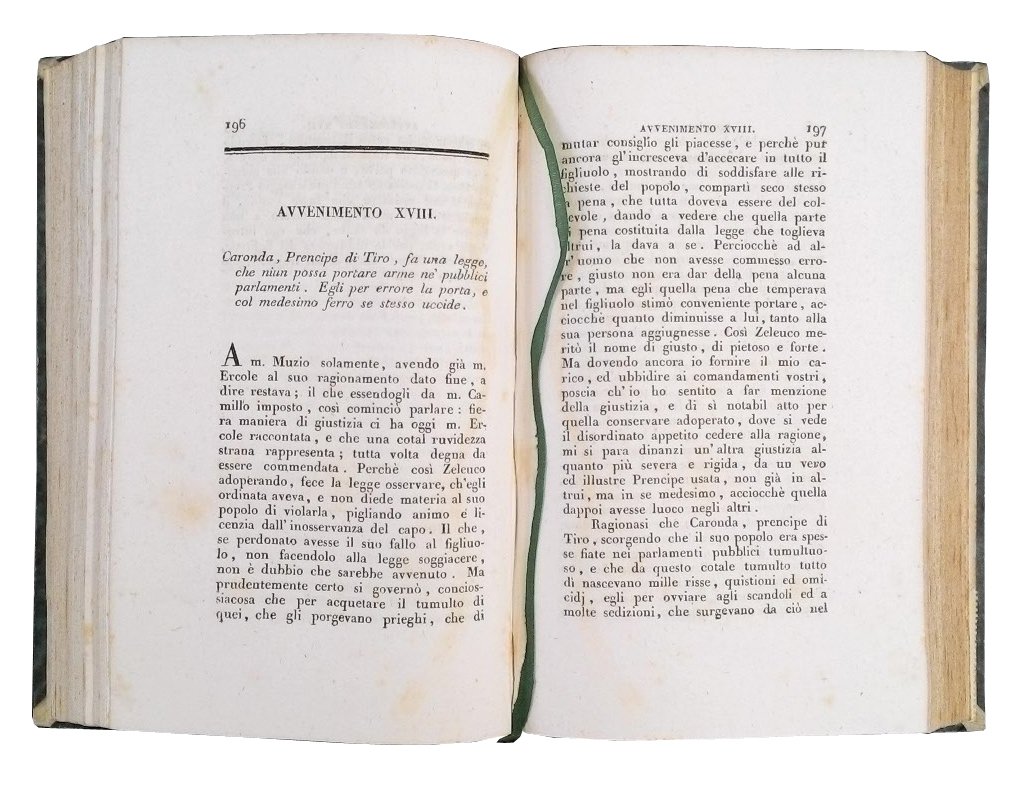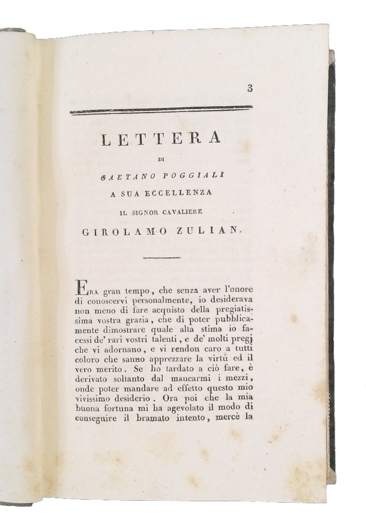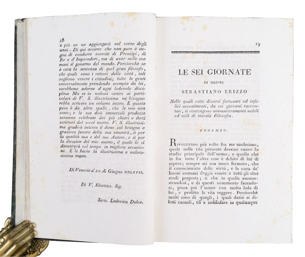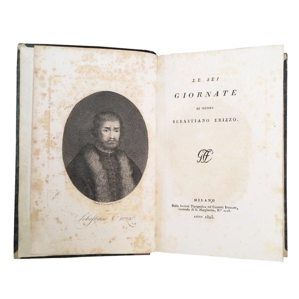 8vo (200x126 mm); leg. in mezza tela edit. marrone, tit. e fregi in oro al ds. su tass. e piatti in carta marmorizzata; pp. 406, (2); ritr. dell'Erizzo in antip. inc. da Paolo Caronni. Prima edizione tratta dall'unica esistente datata 1567, pubblicata a Venezia da Giovanni Varisco con questo titolo: "Le sei giornate di messer Sebastiano Erizzo, mandate in luce da messer Lodovico Dolce, all'Illustrissimo sig. Federico Gonzaga", di cui Gaetano Poggiali ha curato l'ortografia, la punteggiatura, gli errori di stampa, e l'ha restituita a buona lezione. Infatti l'opera si apre con una lettera di Gaetano Poggiali al cavaliere Girolamo Zulian in cui si ricostruiscono le vicende testuali del testo dell'Erizzo e si riporta anche la lettera a Federico Gonzaga scritta dal poligrafo Lodovico Dolce da Venezia, il 15 giugno 1567. L'argomento del testo e' presentato nel proemio ove, sotto diversi e fortunati ed infelici avvenimenti da sei giovani raccontati, si contengono ammaestramenti nobili ed utili di morale. Il volume fu edito per la collana dei "Classici Italiani", il cui programma editoriale, avviato nel luglio del 1802 sotto gli auspici del Ministro della Cultura e favorita dal Melzi, prevedeva la realizzazione della prima grande biblioteca letteraria italiana, composta da 250 opere che abbracciassero cinque secoli di tradizione letteraria. Nella "Bibliografia od Elenco ragionato delle opere contenute nella collezione de' classici italiani" (p. 85) si specifica che questa edizione e' stata eseguita seguendo la precedente di Livorno, 1794. Sebastiano Erizzo (1525-1585), letterato, filosofo, senatore veneziano. Paolo Caronni (1779-1842), incisore, disegnatore milanese. Rif.: IT\ICCU\LO1E\010218. Brunet, II 1047. Cond.: Opera in ottime condizioni generali con leggere fioriture. -- FIRST EDITION OF THIS COLLECTION OF LITERARY COMPOSITIONS, DEALING WITH HISTORICAL AND MORAL TOPICS. Copy in very good condition, with light foxing.