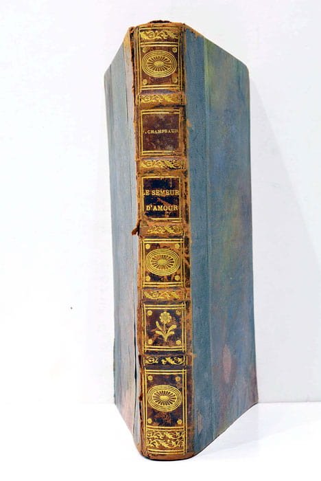 341 pages. 14 feuillets. Introduction XVII. Illustrations et ornements en couleurs hors et dans le texte. (20x13,5cm). Demi-cuir. Couverture brunie et frottée. Dos légèrement déchiré et émopussé, à nerfs orné avec auteur et titre en lettres dorées. Coins émoussés. Couverture d'origine consevée à l'interieur. Publié à Paris en 1925, cet ouvrage de Félicien Champsaur se présente comme un reflet des mouvements littéraires et artistiques de l'époque. Les illustrations de Fabius Lorenzi enrichissent le texte, témoignant de l'importance du dialogue entre art et littérature durant cette période. À travers sa prose, Champsaur explore les thèmes de l'amour et de la passion, des sujets universels qui continuent de résonner auprès des lecteurs contemporains. Pages brunies ave petites taches sasn gravité. Illustrations et ornements en couleurs hors et dans le texte. Couverture d'origine consevée à l'interieur. Bon exemplaire.