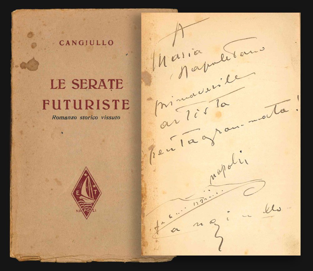 LIBROEdizione originale.CON AUTOGRAFO.Esemplare pregiato da bella dedica autografa dell’autore vergata in grande alla prima carta bianca: «A Maria Napolitano primaverile artista pentagrammata!», datata Napoli e firmata con il profilo stilizzato del Vesuvio. Mende alla copertina (mancanza al piede del dorso e distacco ricomposto alle cerniere; interno pulito con minime occasionali e leggerissime fioriture).«[.] essenziale per la conoscenza del futurismo [.]. il Materiale di fondo è stato abbozzato nel periodo in cui l'autore è ancora all'interno del movimento [.]. Complessivamente, il libro poggia su una griglia densa di particolari, di scorci d'ambiente, di compenetrazioni di memorie e di cronaca, che trasformano il tutto in una specie di riassunto di vicende proverbiali scritto da un naïf» (Diz. Fut., p. 196c s).Cammarota, Futurismo, 76.24