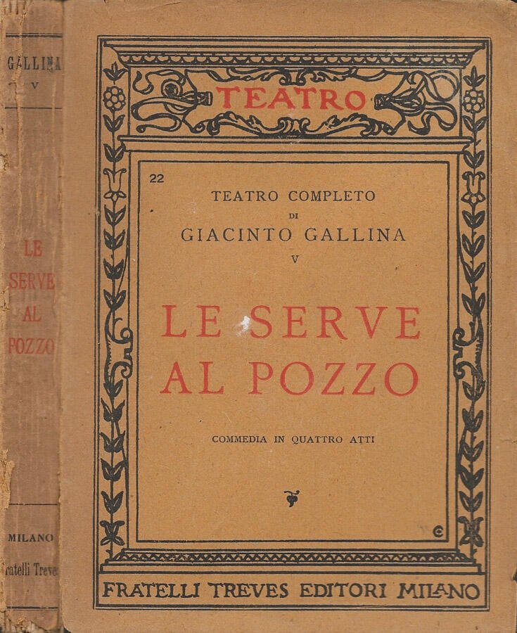 Coperta imbrunita e segnata da fattore tempo con irregolarità ed usura ai margini, alle punte e al dorso, legatura allentata alle pagine iniziali, tagli imbruniti ed irregolari, pagine con imbrunitura, testo completamente fruibile, volume appartenente alla collana "Teatro - Serie: Teatro completo di Giacinto Gallina" curata da Domenico Varagnolo (n. 22 della collana e n. 5 della serie), con prefazione di D.V., numero pagine 162