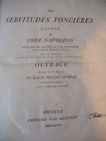 PRIMA EDIZIONE, testo francese a fronte. Ridotte in casi pratici incisi in rame corredate d'annotazioni desunte dalle leggi romane e da classici autori. Opera divisa in libri V e tradotta in italiano da Camillo Ugoni. Raccolta di leggi riguardanti le servitù prediali di Napoleone illustrate da casi pratici tramite incisioni in rame. Con 114 incisioni e 24 tavole. Cartonato coevo ottime condizioni e ex-libris. Pp. LV+127