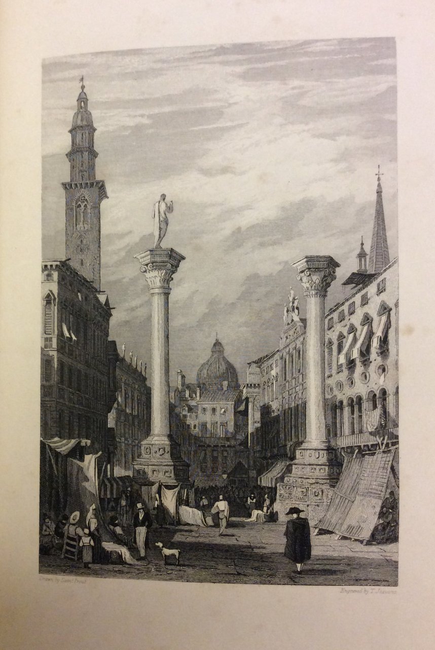 In-8 gr. (mm. 247x162), mz. pelle coeva, ricca decoraz. oro e a secco ai piatti, decoraz. e titolo oro al dorso, tagli dorati, pp. (4),355, con antiporta e 14 belle tavole inc. su acciaio fuori testo (protette da velina con didascalia) che raffigurano vedute del lago Lemano, Martigny, Aosta, Sion, Isola-Bella sul lago Maggiore, Milano, Lago di Como, Vicenza, Venezia, Rimini, Firenze, Ventimiglia. Affascinante viaggio dal Cantone di Ginevra attraverso l'Italia settentrionale, l'Emilia, le Marche e l'Umbria con rientro via Firenze, Pisa, Genova fino a Marsiglia. "Edizione originale". Cfr. Lorenz,IV, p. 404. Con qualche fiorit. e pagine con lieve uniforme arross. per la qualità della carta, ma tavole fresche e ben conservate.