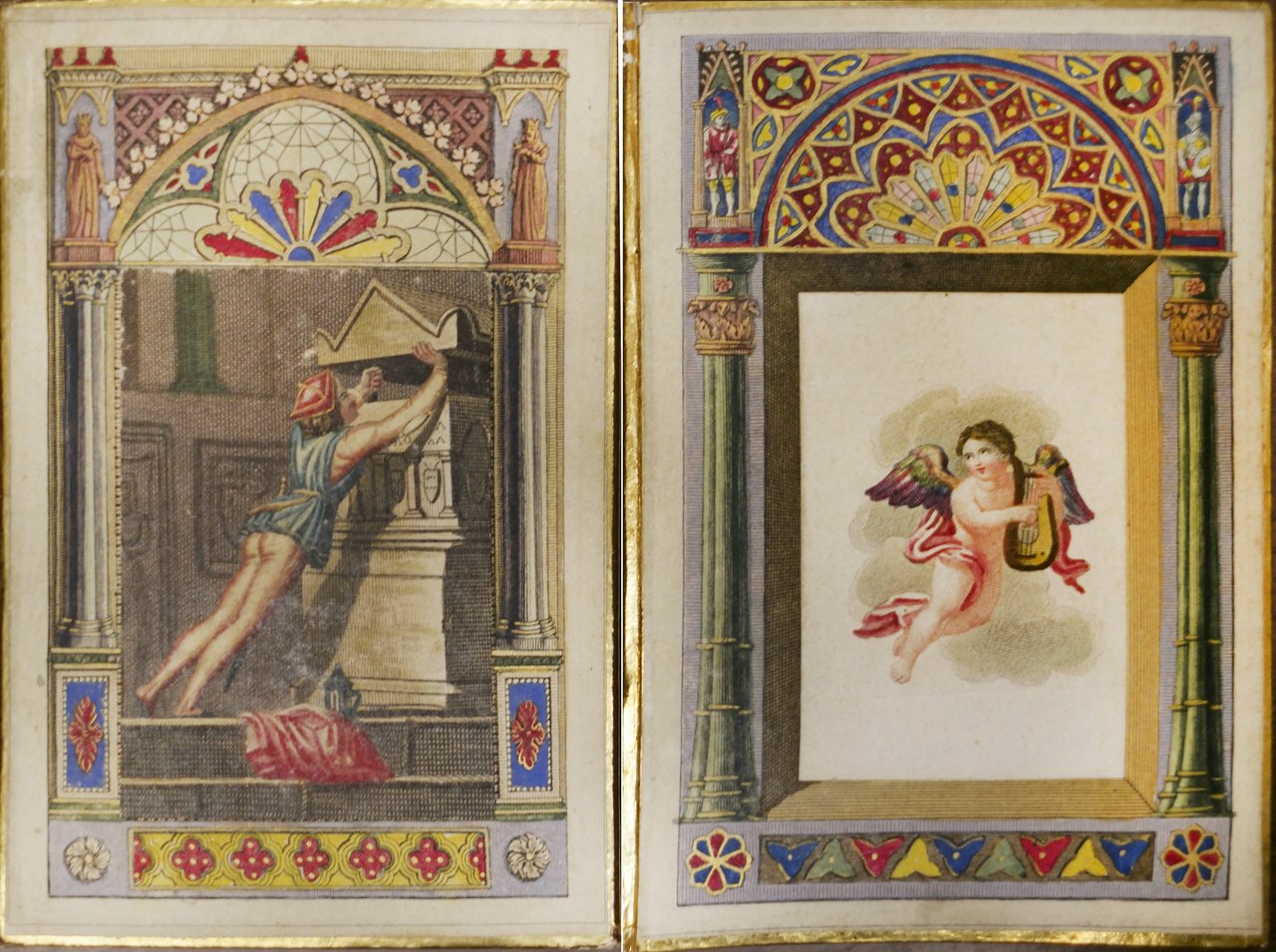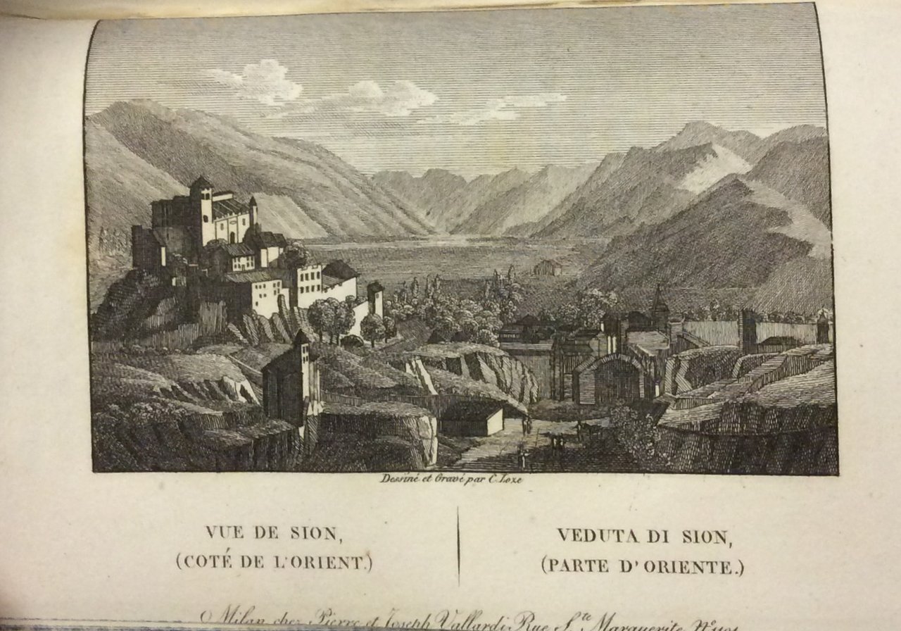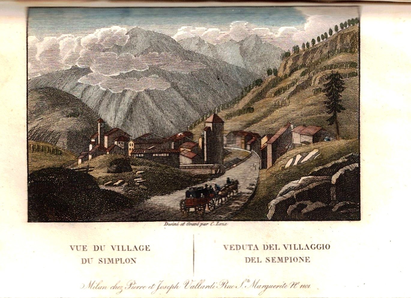 In-24 gr. (mm. 144 x 85), mezza pelle coeva (lievi aloni ai piatti), fregi e titolo oro al dorso, pp. 250, frontespizio inc. in rame e 6 belle tavole di vedute fuori testo, inc. e disegnate da C. Lose: Ponte di S. Maurizio - Sion (parte d'Oriente) - Villaggio del Sempione - Galleria del Gabbio - Interno della Grande Galleria - Galleria dell'Isello, con coloritura a mano coeva. Questa affascinante passeggiata ha inizio dal lago di Ginevra, via Martigny, il Sempione, Domodossola, Arona, Milano, con ritorno ai ghiacciai svizzeri, il monte Cenisio, i Pirenei e la Grande Certosa di Grenoble. In Appendice calendario per l'anno 1829, con 4 pregevoli vignette dedicate alle 4 stagioni.Lieve alone su tutte le pagine, altrimenti buon esemplare.