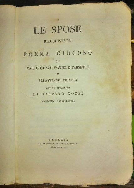 In-8 (20 cm) XXIII (1) 232. Brossura editoriale. Parzialmente intonso, in barbe; carta vergatina settecentesca. Piatti usurati agli angoli; gora insistente alle ultime carte. Prima edizione. Carlo Gozzi (1720-1806). Nato a Venezia nel 1720 da famiglia nobile, ma in gravi difficoltà economiche. Carlo si rifiutò sempre, per orgoglio aristocratico, di ricavare guadagni dalla sua attività di letterato. Nel 1747 fu con il fratello Gasparo tra i fondatori dell'Accademia dei Granelleschi di Venezia, una delle istituzioni più conservatrici del XVIII secolo italico. In polemica con Goldoni e con Chiari, colpevoli di aver messo in scena argomenti troppo realistici e plebei, pubblicò alcuni scritti satirici, come "La tartana degli influssi per l'anno 1756" (1757). Nel 1761- 1765 fece rappresentare con successo dalla compagnia del 'Truffaldino' Antonio Sacchi dieci Favole teatrali che riprendevano schemi e maschere della commedia dell'arte. In tutta l'opera di Carlo Gozzi costante è l'acre, pungente e puntigliosa polemica contro i princìpi illuministici. Raggiunge apprezzabili esiti solo quando, allentata la tensione, la polemica si risolve in invenzioni umoristiche e fantastiche. Morì a Venezia nel 1806. L'argomento di questo "giocoso poemetto" fu tratto da un'avvenimento del secolo decimo che gli "Istorici veneziani" riportano come accaduto tra il 920 e il 944, sebbene non siano concordi tra loro sull'anno preciso;…in quel "tempo in cui si vuole che in Venezia le donzelle promesse a marito si portassero annualmente alla Chiesa di S. Pietro in Castello col corredo ognuna della propria dota, per effettuare coi sacri riti il loro matrionio. Di tale costume istruiti li Corsari triestini macchinarono di rapire insieme colle Spose le dote,…, cogliendo all'impensata le Spose mentre li veneziani disarmati impedir non poteano così perversa soperchieria.
